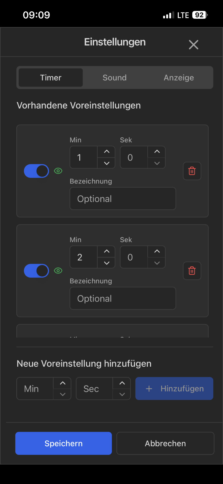 - Individual timer with minutes and seconds