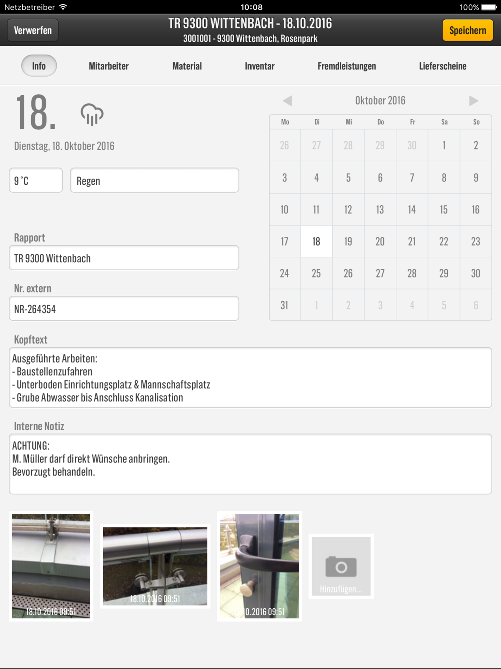 In the "Info" section, general data such as weather, temperature, report designation, external and internal text, etc. can be entered. Each daily report can be supplemented with multimedia data such as photos, video and voice recordings, etc.