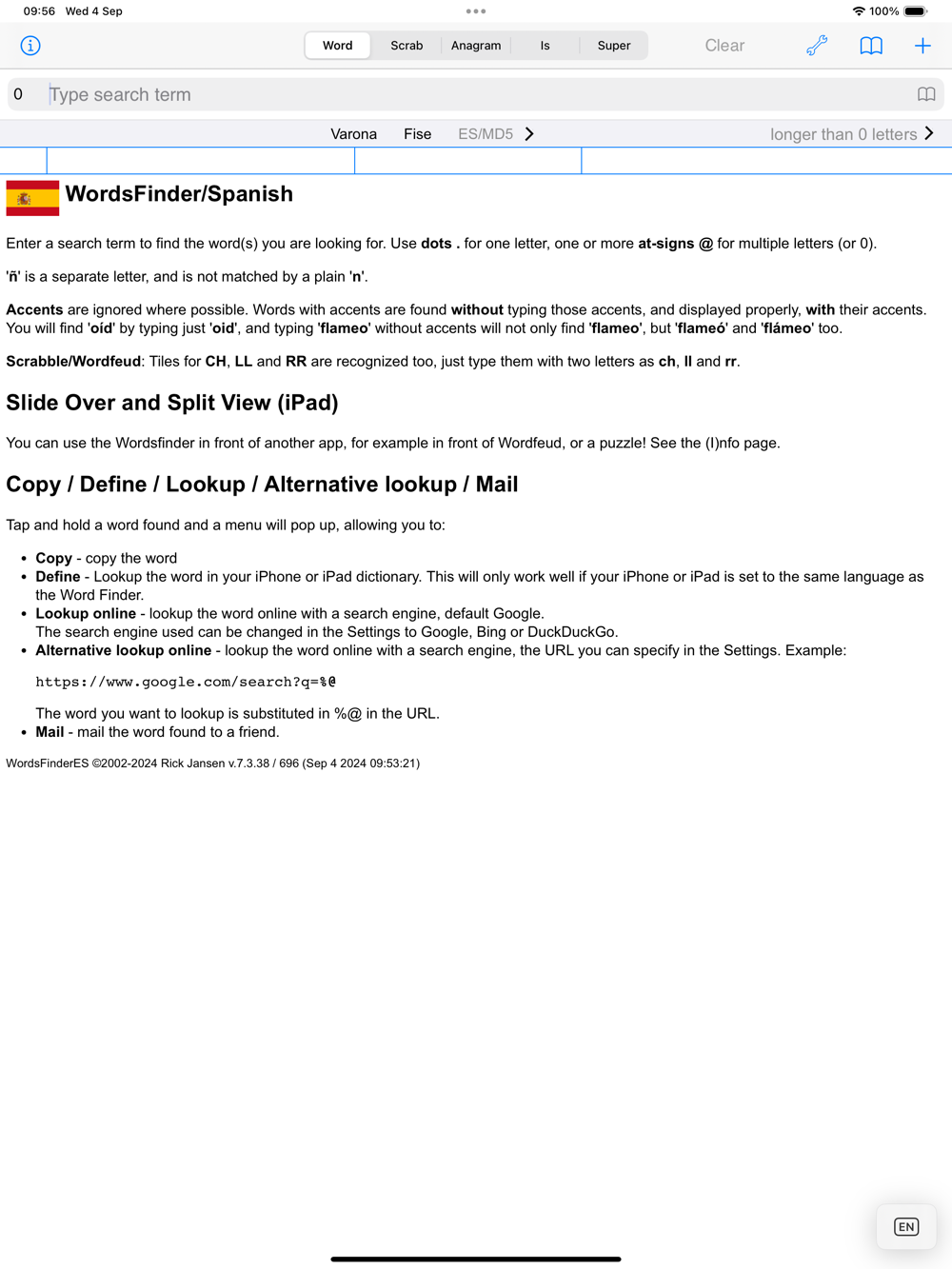 Enter the search term to find the word(s) you are looking for with a dot (.) for one letter, and/or an at-sign (@) for multiple letters. More than 770.000 words are included, without the need for an on-line connection.