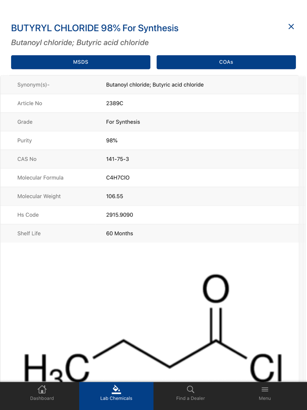 LobaChemie is the only App in the world that allows its customers to download Material Safety Data Sheets (MSDS) for lab chemicals and Certificate of Analysis (COA) for every batch.