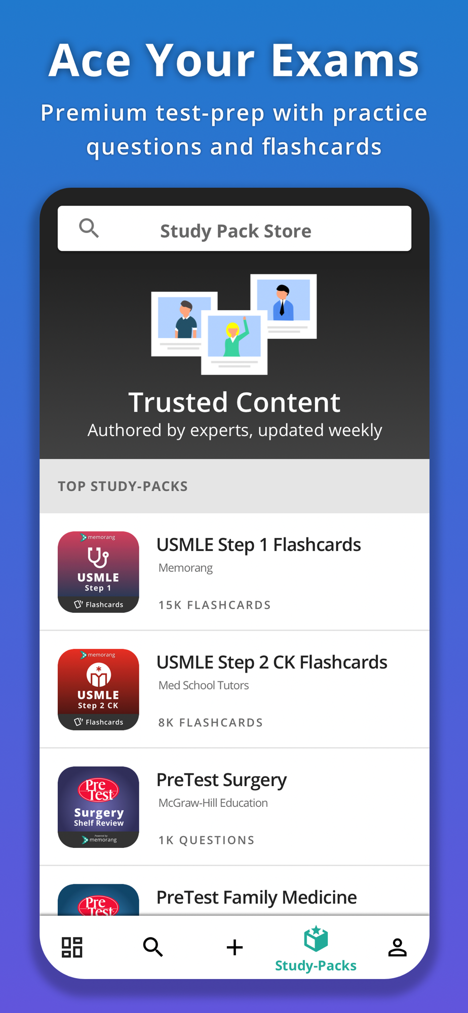 Note: Each Study-Pack contains restricted, premium content that requires an in-app purchase in order to access it for a limited period of time (e.g. 12 months). When this period expires, you will lose access as Memorang does not support auto-renewal. If you wish to extend your access (e.g. you moved your exam date), you can add time via additional in-app purchases.