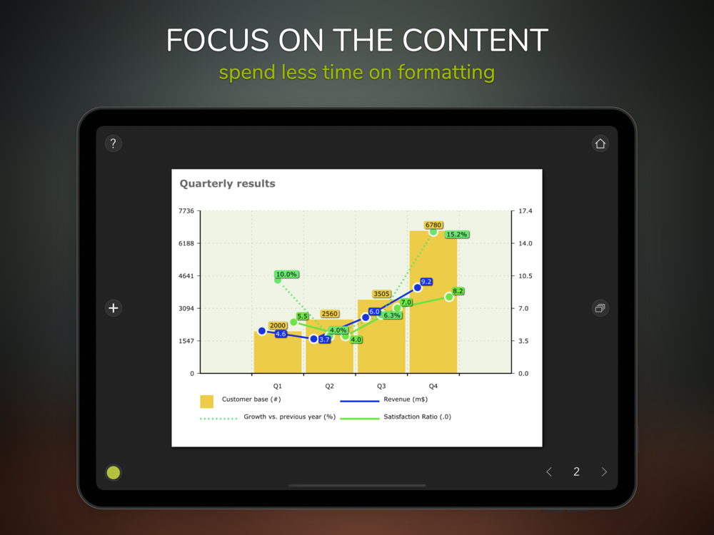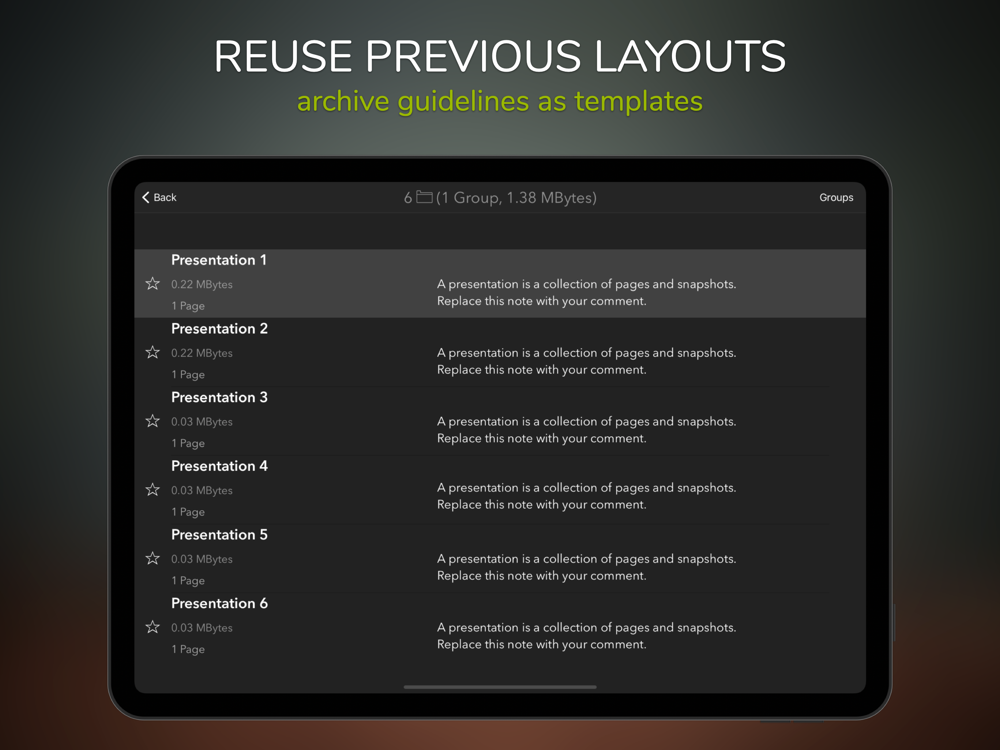 Crear presentaciones en un dispositivo móvil puede ser a veces problemático. Especialmente durante los tránsitos (en un tren, durante los vuelos, etc.). Esta aplicación resuelve el problema con diapositivas ya ajustadas para una reunión profesional. Seleccione la que mejor se adapte y añada contenido adicional si es necesario.