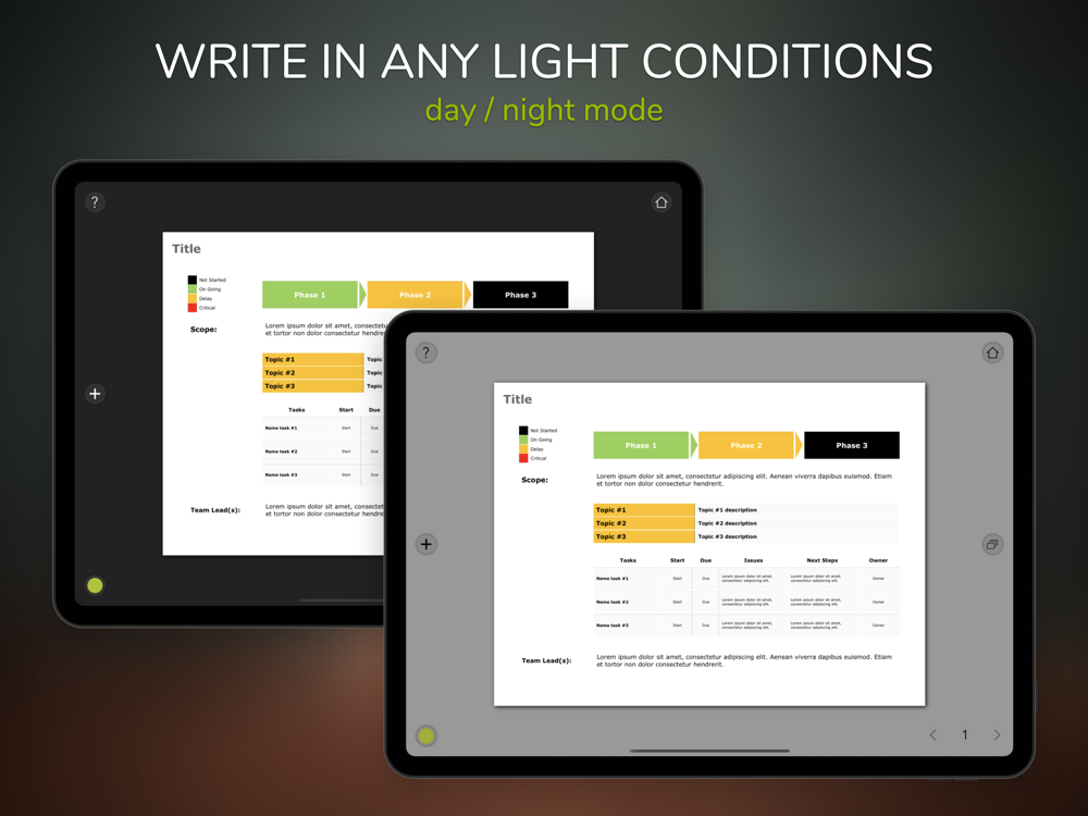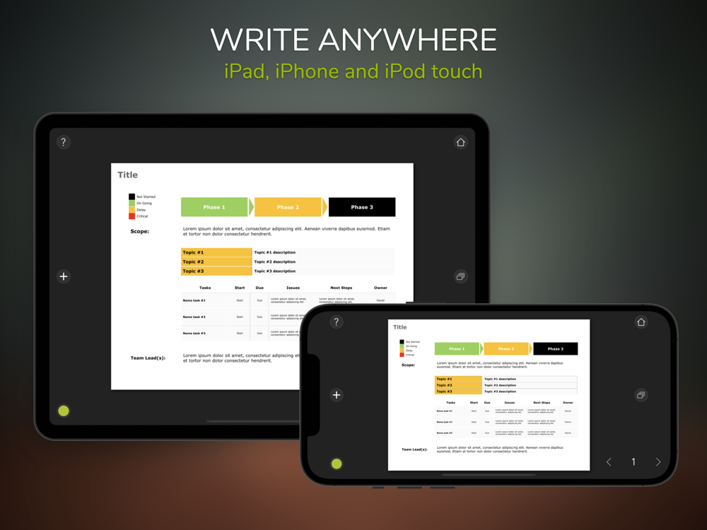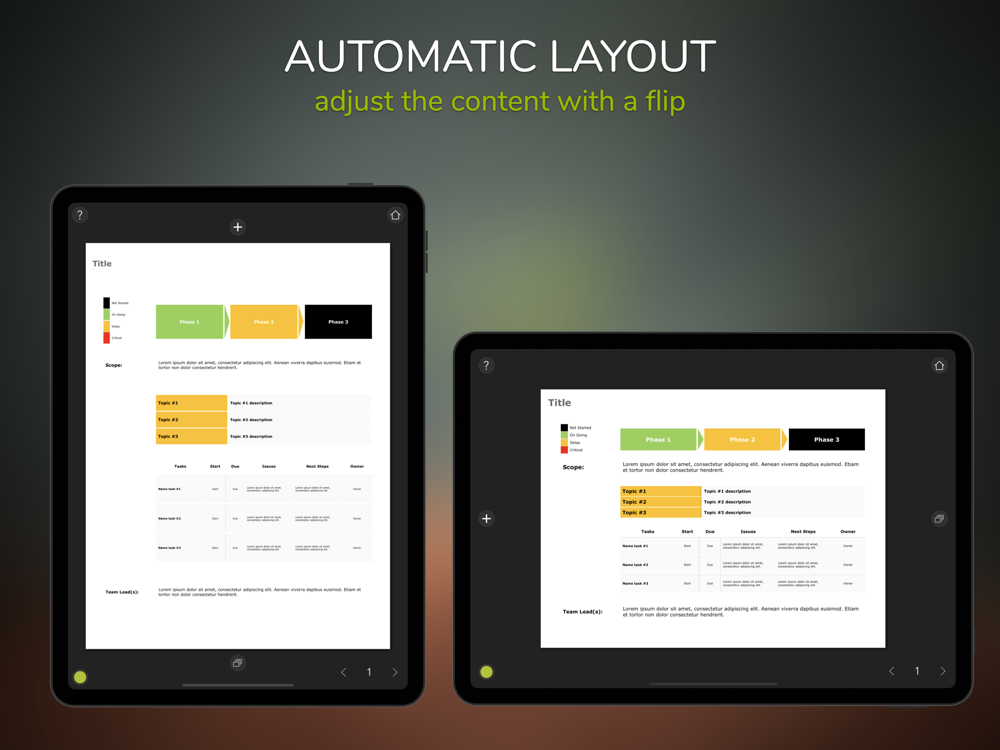 Los elementos añadidos a la página se recolocan automáticamente en función de la orientación del iPad. Puedes imprimir el mismo documento en dos versiones diferentes (vertical y apaisada) con sólo un giro.