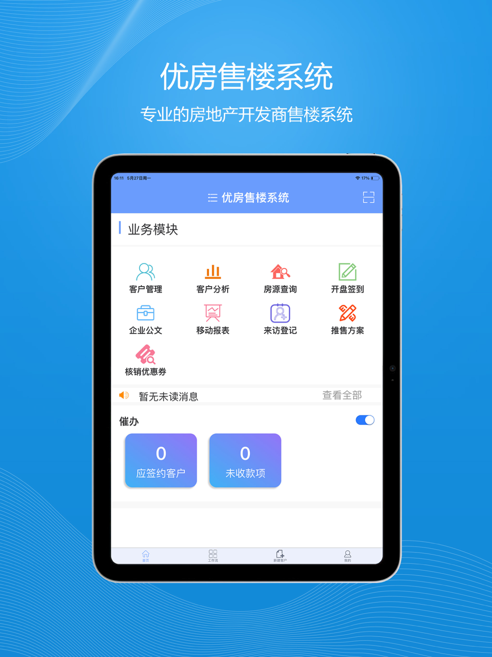 优房售楼系统主要是用于房地产销售辅助APP,功能模块包括营销公文(公司内部公文查看),通讯录(公司内部人员电话号码查询),客户管理(客户录入管理跟踪),房源查询(所属楼盘的房源信息查询)等