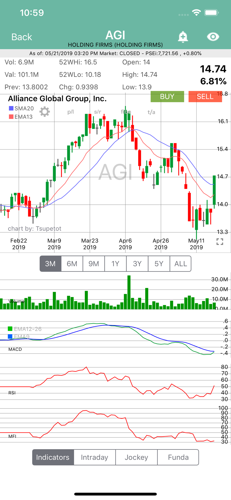 Whether you are a local from Philippine or a foreign investor, this is the tool for you to easily view real-time Philippine stocks latest market values and historical charts with standard indicators like MACD, RSI, MFI, SMA20 and EMA13.