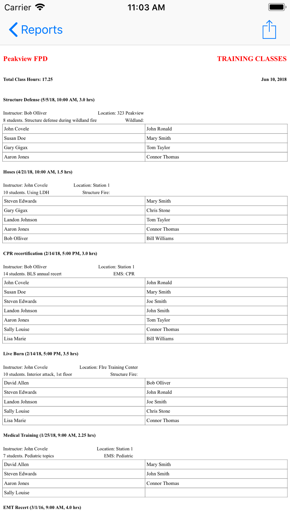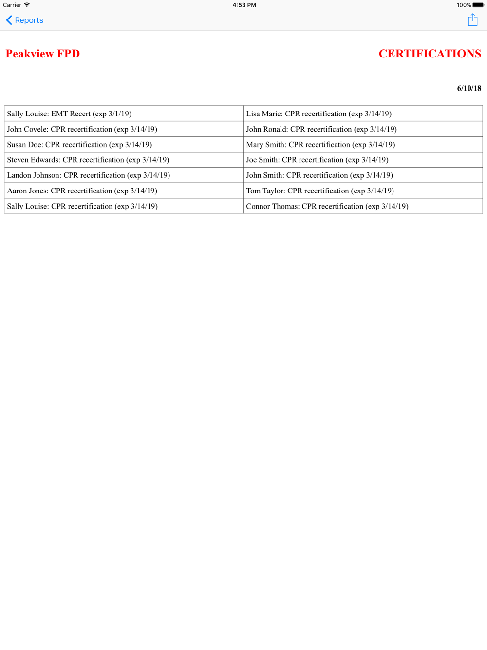 Manage training hours and certifications for your entire department with this easy-to-use yet powerful app. Log in from an iOS device (iPad works best for data entry) and enter a training class or certification in seconds. There are many reports to choose from.