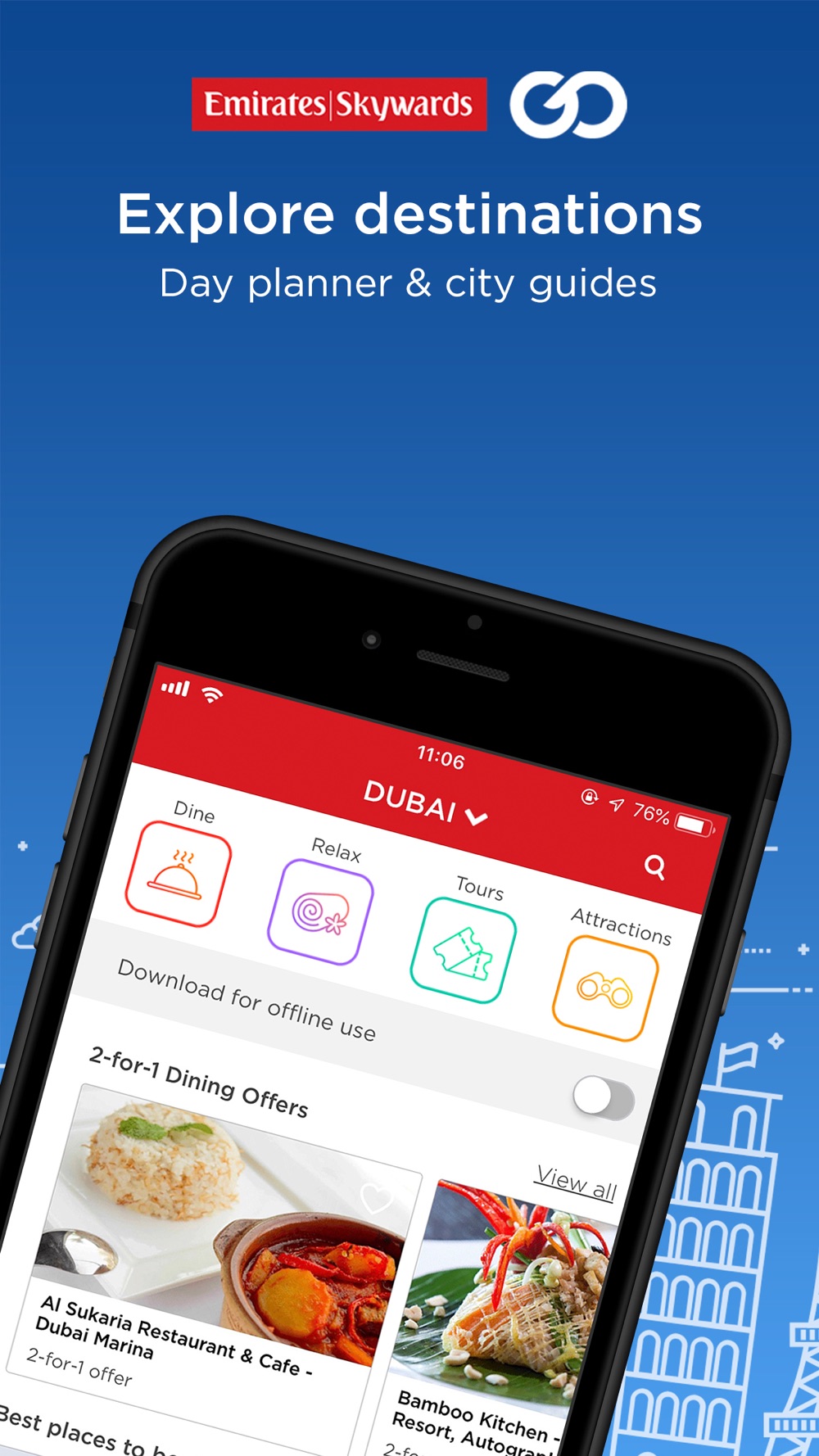 If you’re planning a short break, or want to enjoy discounts closer to home, there’s not a minute to waste. Download Emirates Skywards GO for travel guides to over 160 destinations. There’s also a day planner where you can add activities to your wish list. Once you’ve decided what to do and see, you can make booking for over 50,000 attractions, all on your mobile phone.