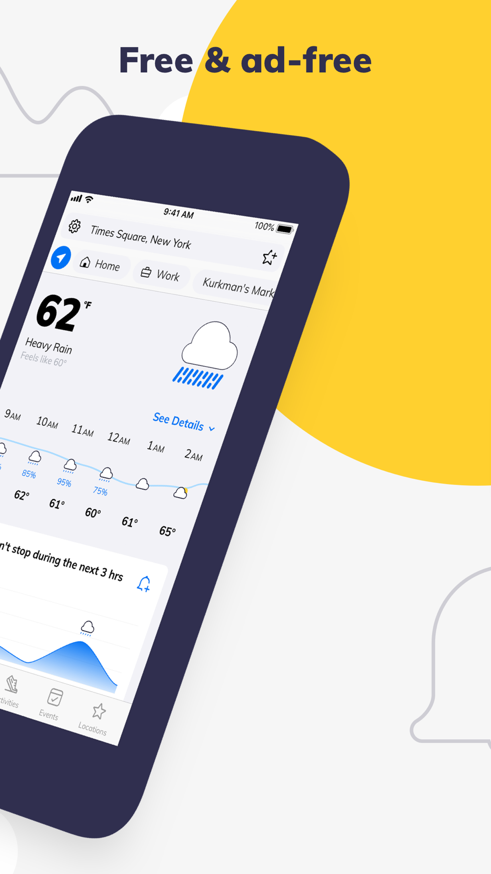 Be prepared and plan smartly with global minute-by-minute and street-by-street hyper accurate forecasts, rain and snow alerts, air quality maps and wind speeds.
