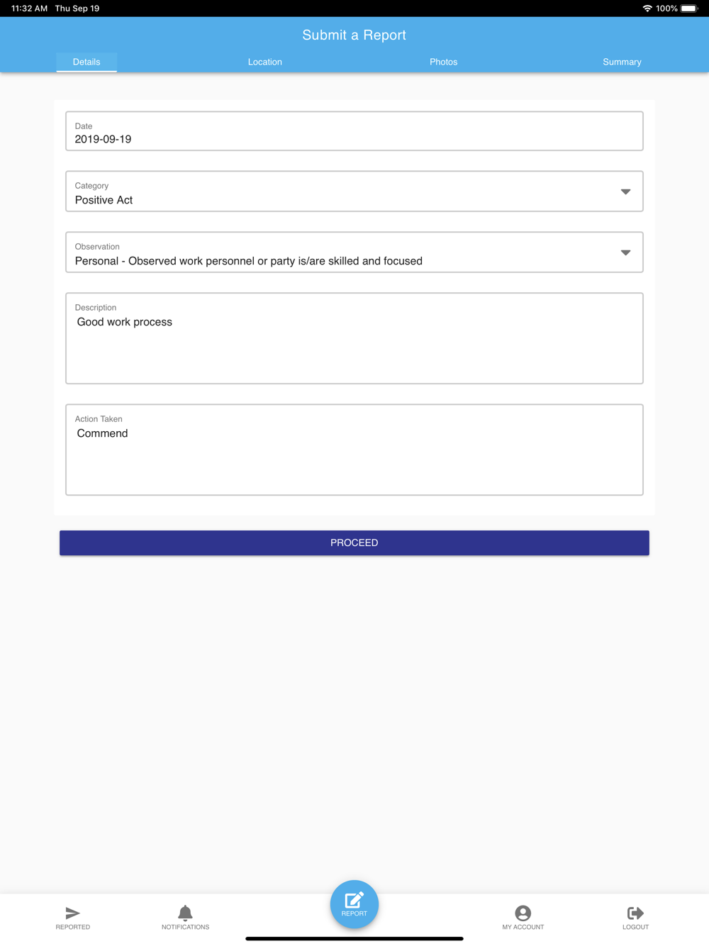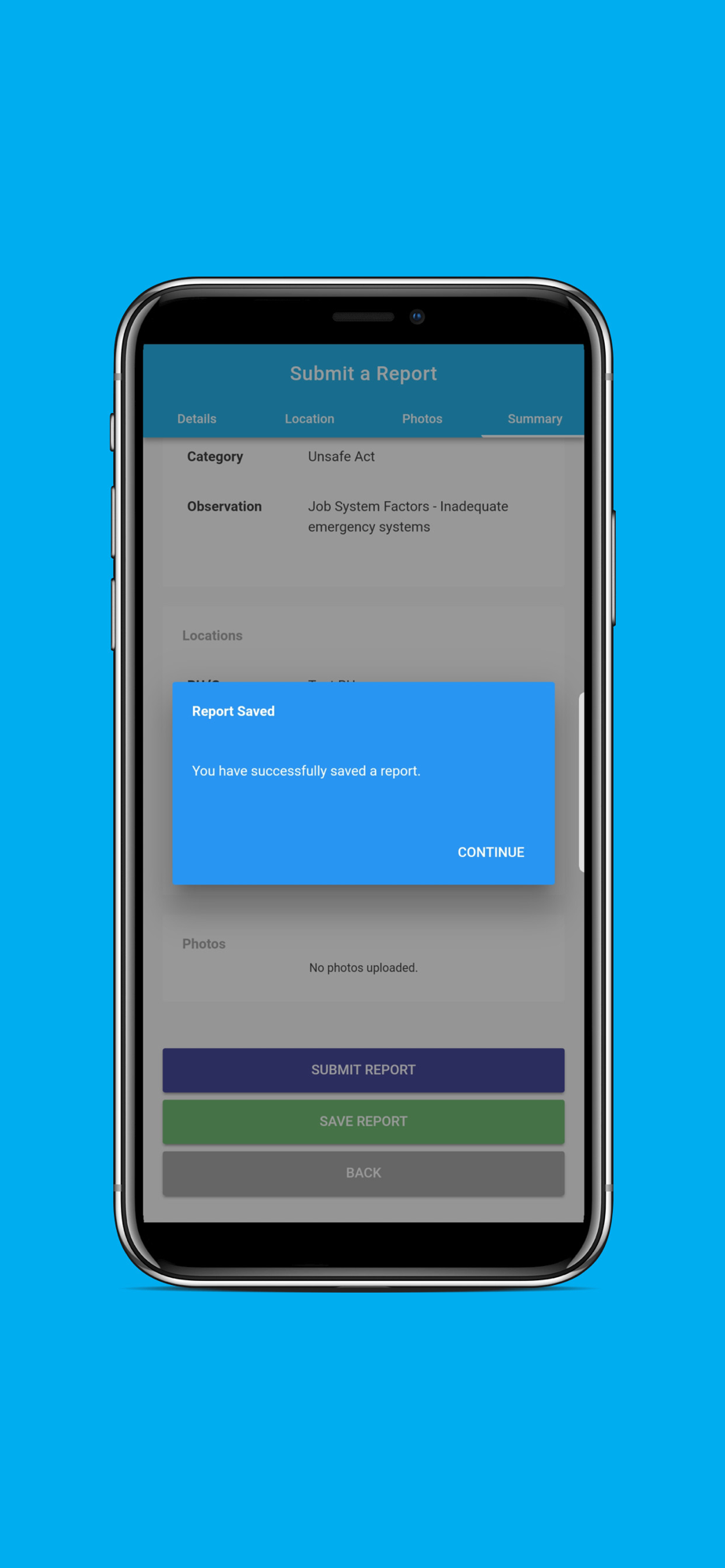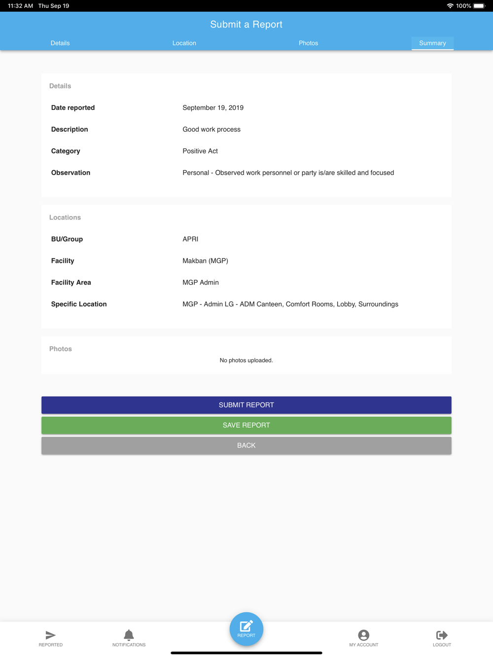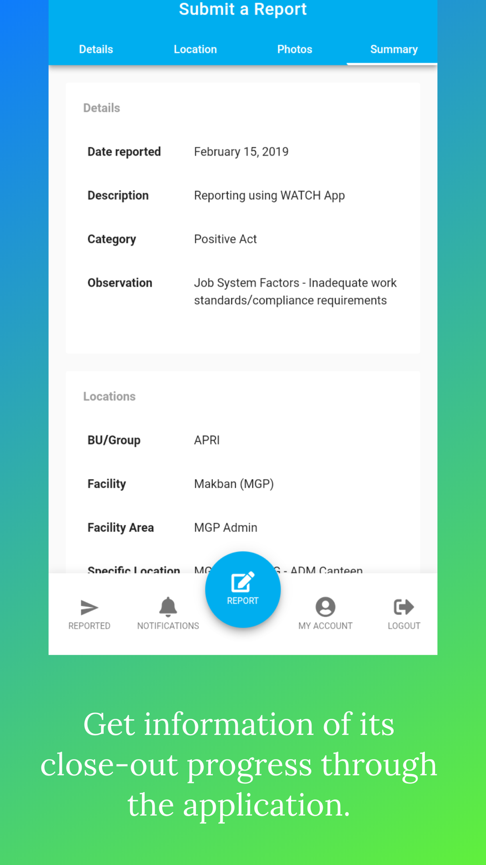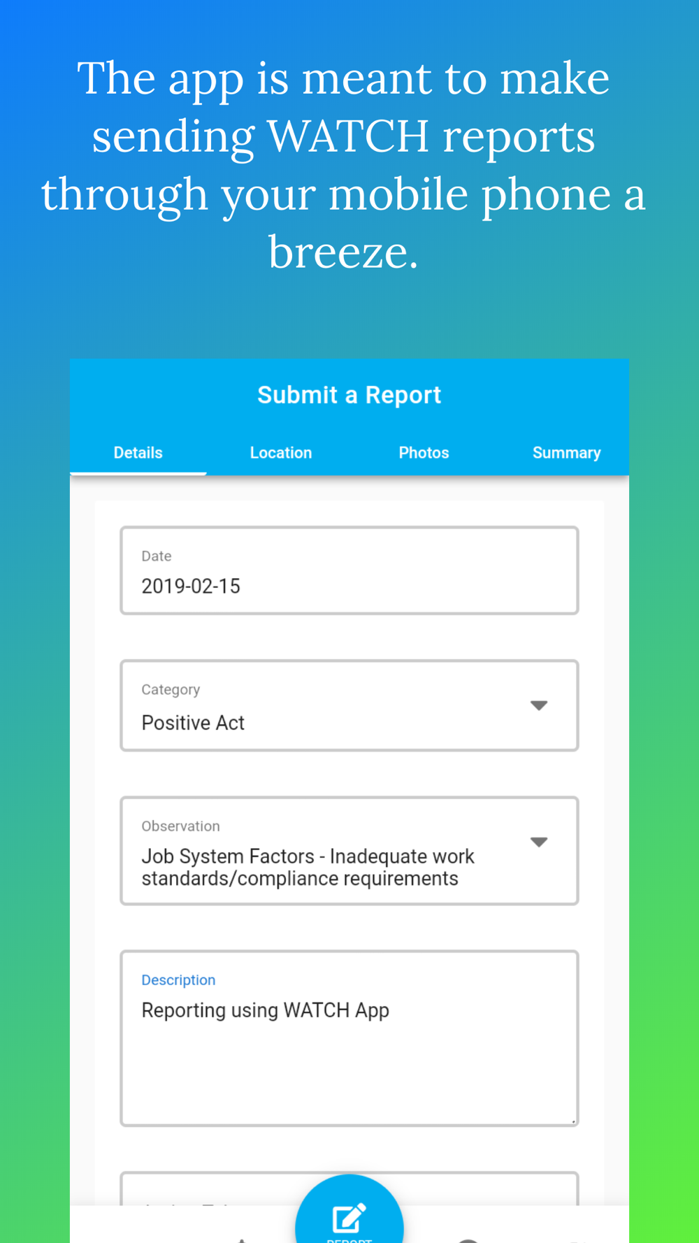 The application is a digital version of the WATCH Card. The app is meant to make sending WATCH reports through your mobile phone a breeze and get information of its close-out progress through the application.
