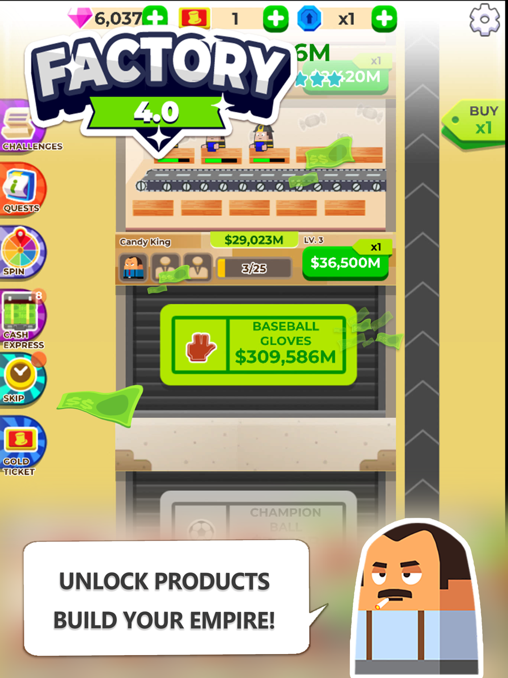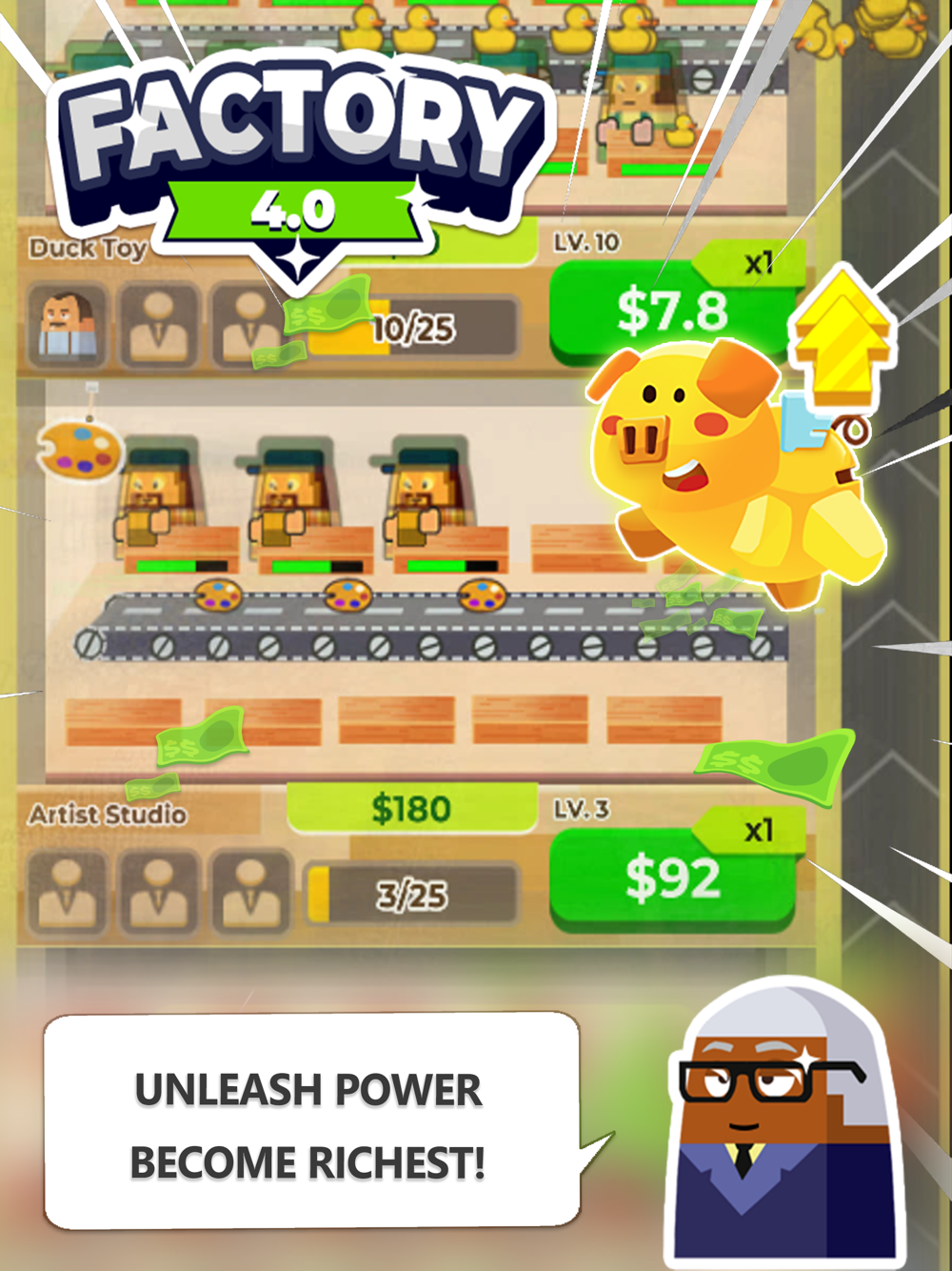 In Idle Factory 4.0, you start as a duck toy factory and build your business to become the biggest corporate in the world!