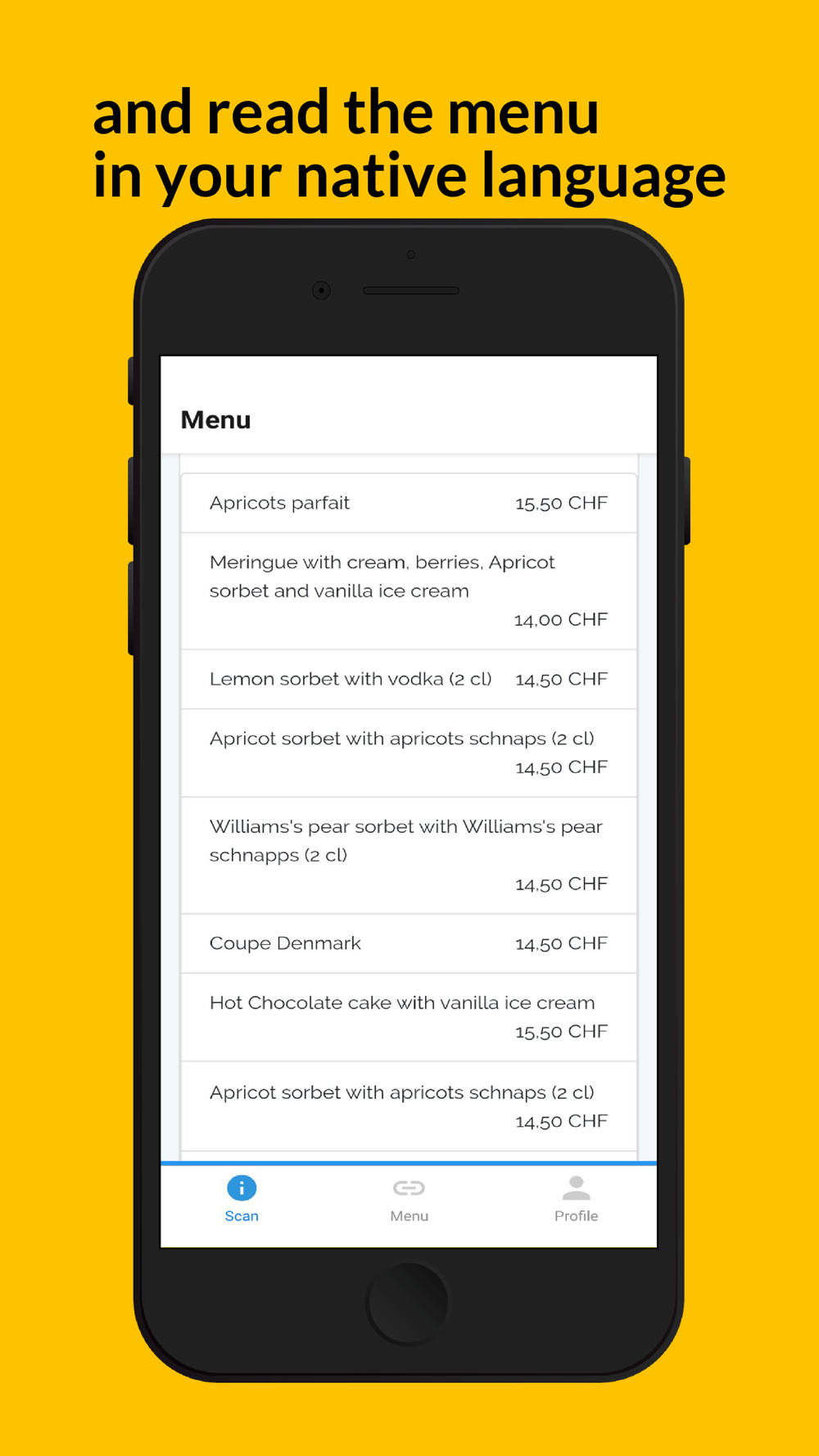Scan the QR code. That's all you have to do to read a menu in your native language. To be able to use additional functions, you have to download the app, open it and register as a gourmet.