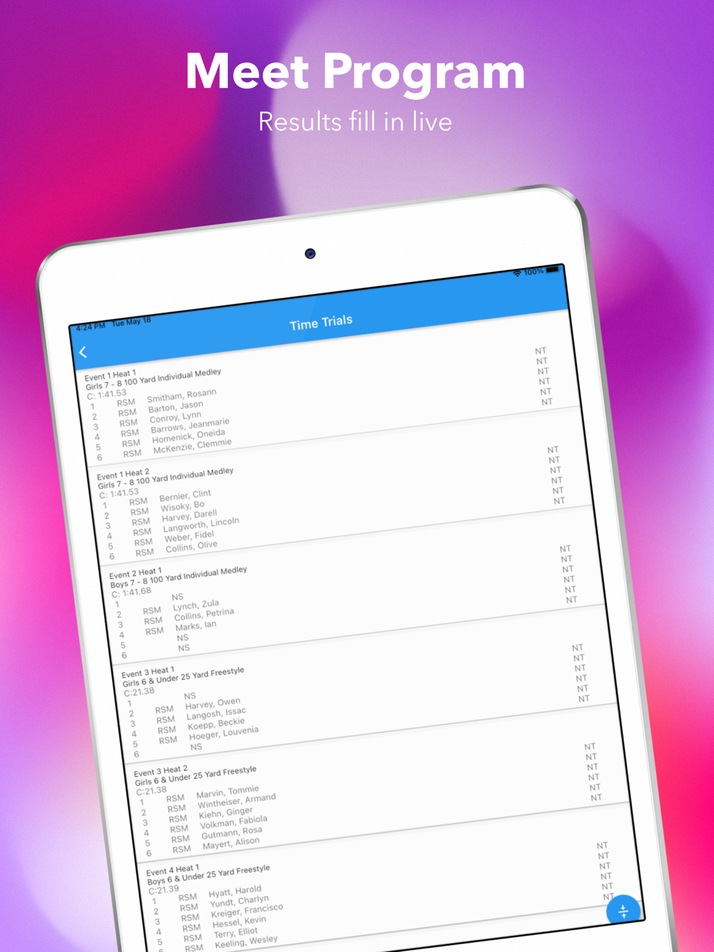 This app ties in with the Time Drops timing system. Heat results are refreshed into your screen instantly.