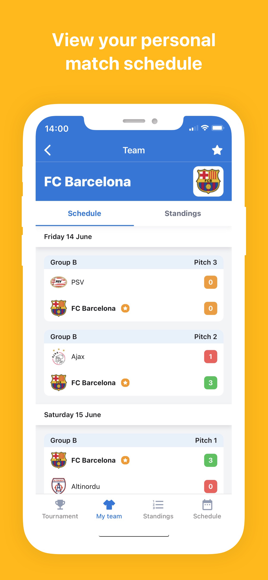 Our iPhone app is made especially for participants and spectators. Do you organise a tournament yourself? Please go to www.tournifyapp.com and create your own tournament schedule in minutes.
