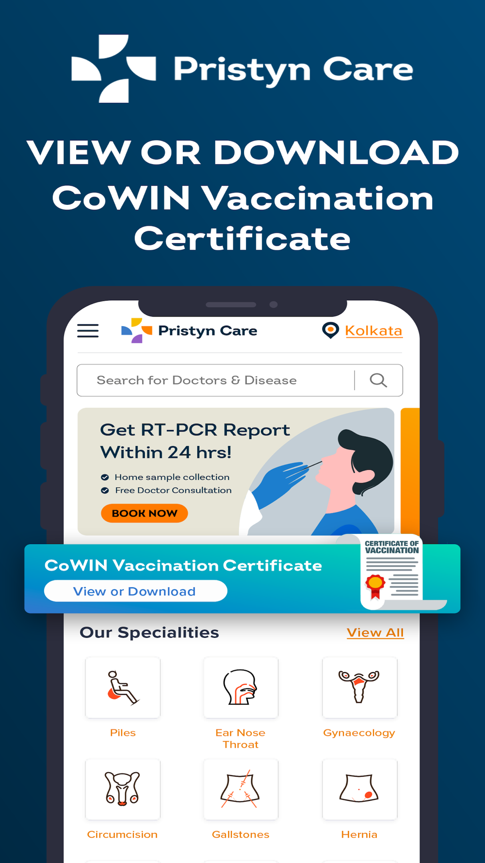 - View/Download the 1st dose, 2nd dose, and Booster dose certificate by using your CoWIN registered mobile number. Downloaded certificate will be stored offline on your Pristyn Care App