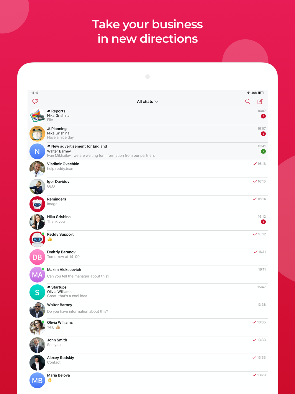 Keep in touch with your colleagues and clients, organize your contact list, set reminders and keep track of tasks – all in the mobile app.