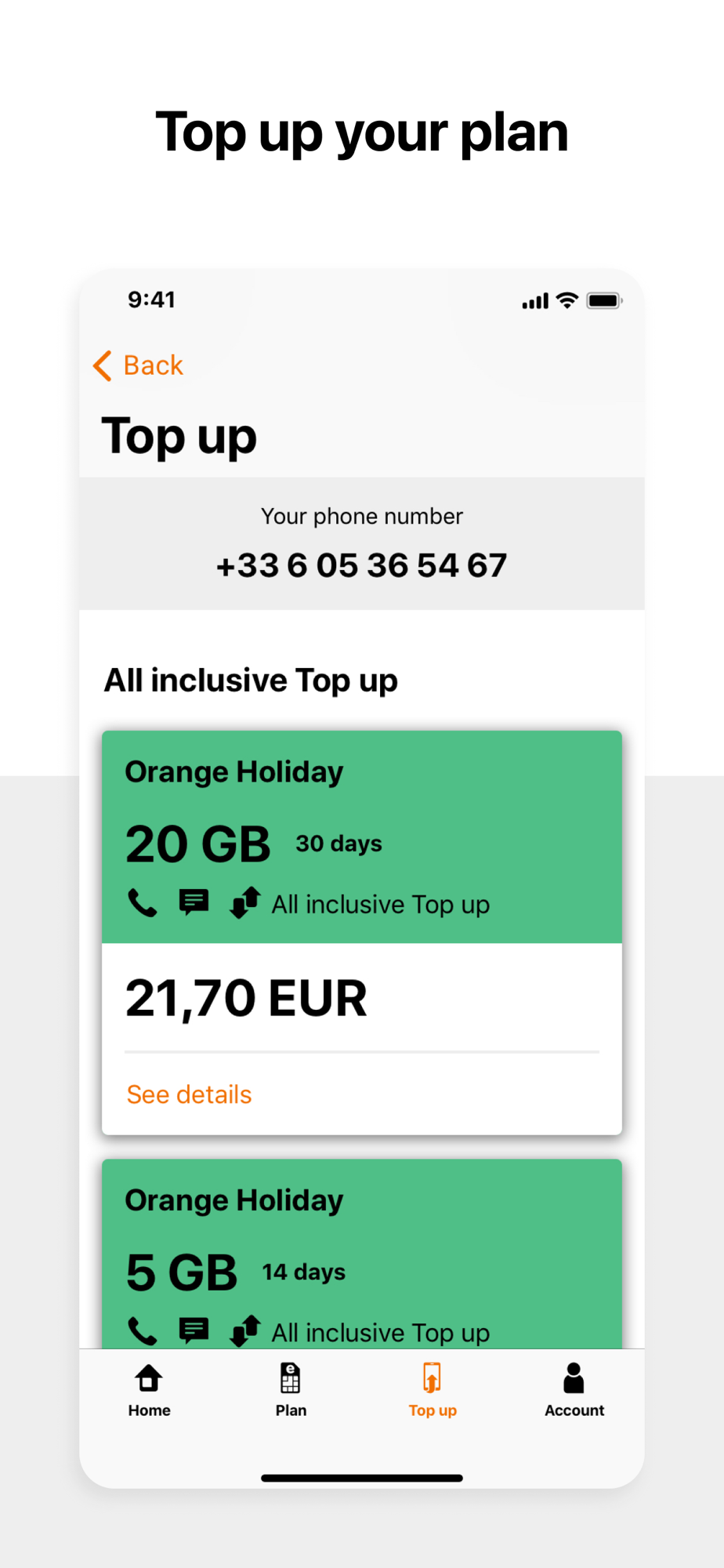 Don’t worry about staying connected in 4G or 5G during your trip abroad. With Orange Travel app, you can buy from home, top up and manage a generous local eSIM plan comfortably, in a few clics and avoid roaming fees.