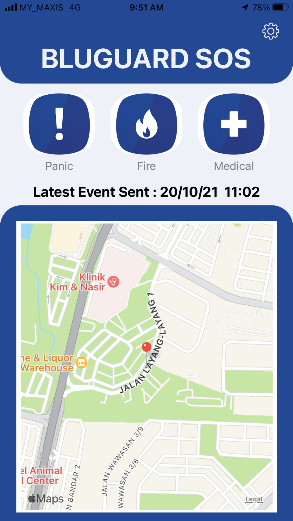 Bluguard SOS App is an emergency app that enables you to quickly send out your current GPS location along with your Panic/Fire/Medical event to the center. The operator at center will immediately process the incoming event and take action accordingly.