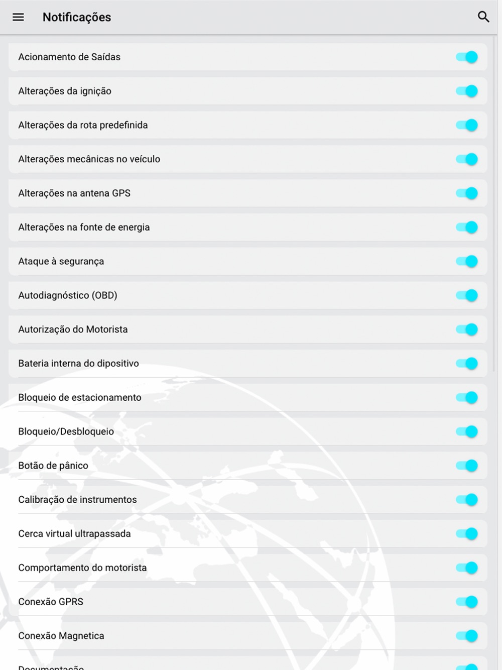 - Notificações push personalizadas, onde o próprio usuário escolhe quais tipos de alerta deseja receber através de push. São 30 categorias de alertas disponíveis ao usuário, dentre eles: alteração de ignição, limite de velocidade violado, ataque a segurança, pânico, entre outros.