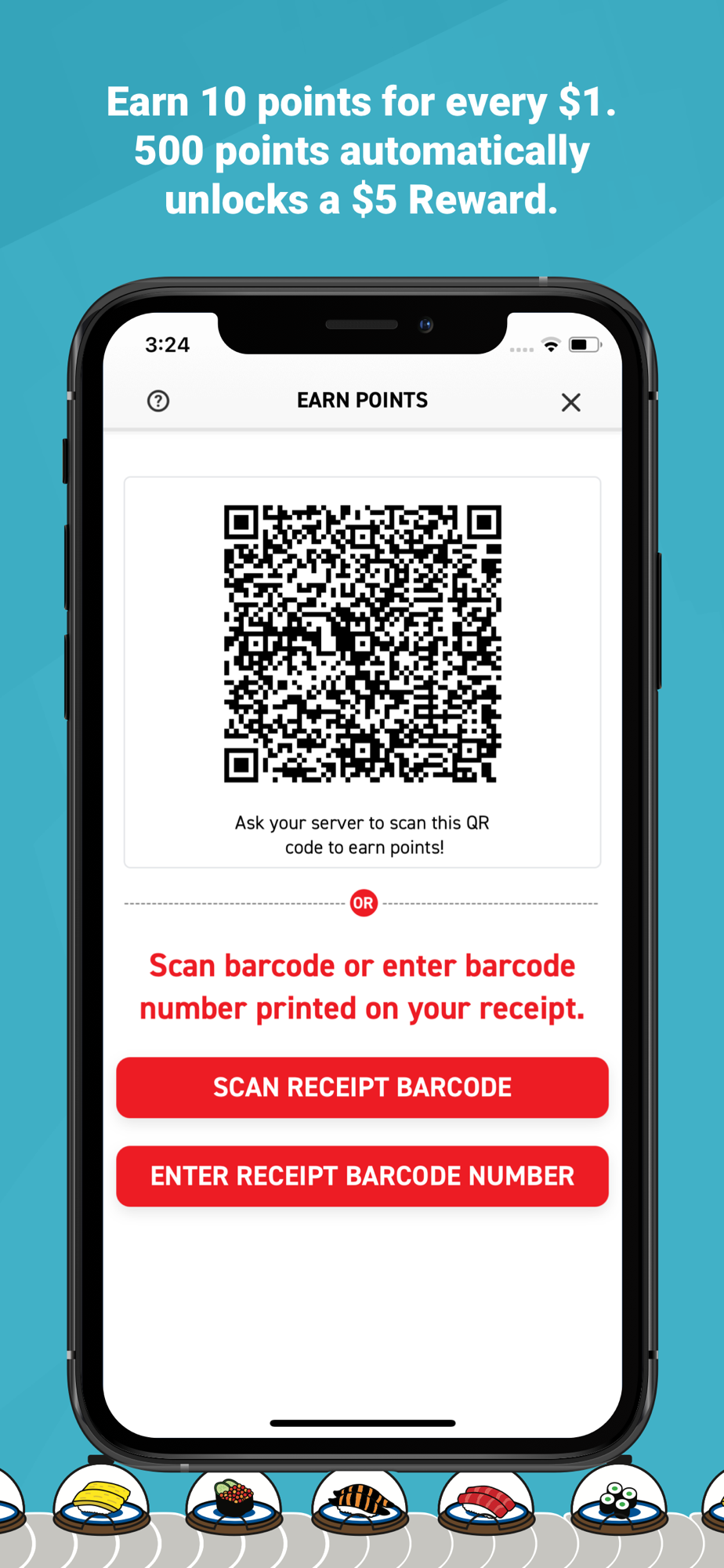 • Earn 10 points for every $1 spent in the restaurant or online at order.kurasushi.com and receive 300 bonus points when you sign up or migrate your account.
