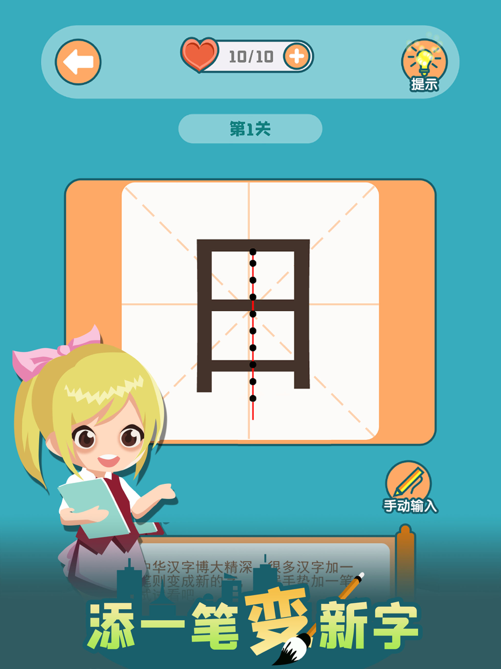 这是一款有趣的汉字益智游戏,游戏能够帮助我们更好的了解汉字文化。游戏玩法简单,只需在关卡的文字中添加一笔,变成全新的汉字即可过关,游戏玩法简单但富有挑战性,随着游戏的进程难度会逐渐增加,挑战玩家对汉字的记忆力,玩起来轻松解压也富有成就感,你能挑战几关呢?