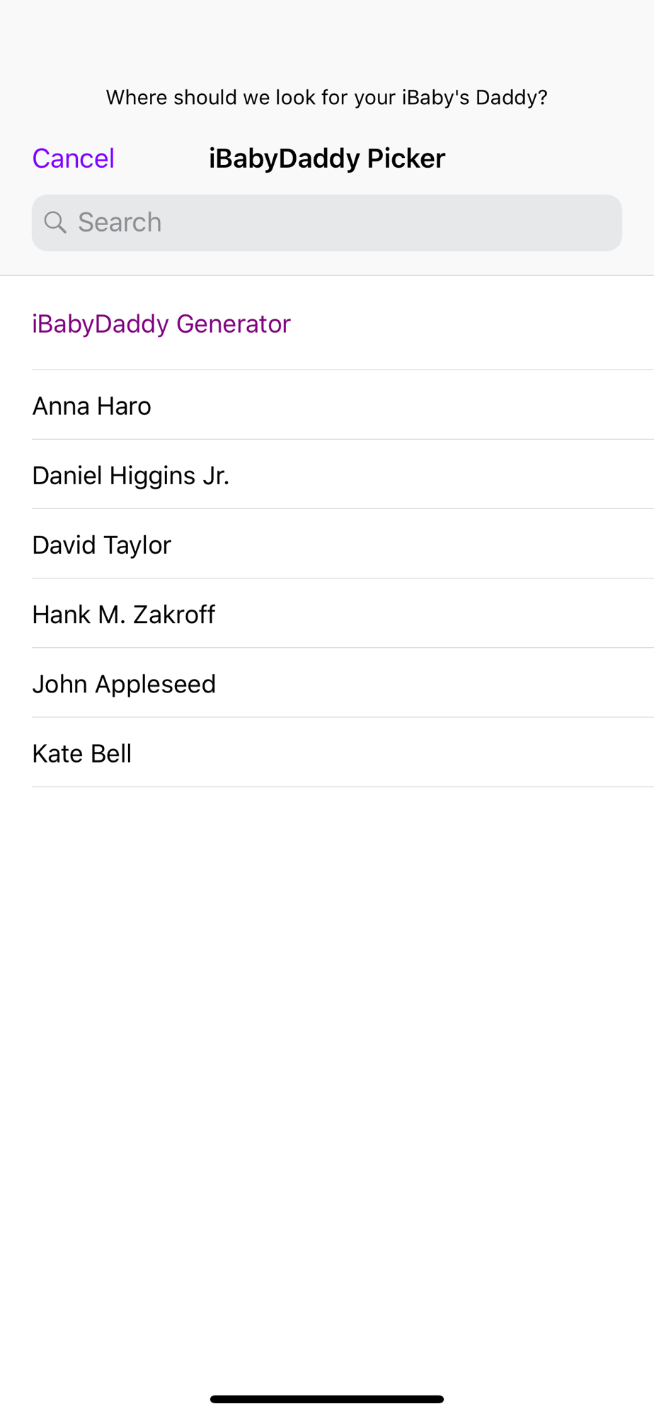 - iBabyDaddy Picker. If you know who iKnocked you up already, just search or select from your Address Book contacts and let them know!