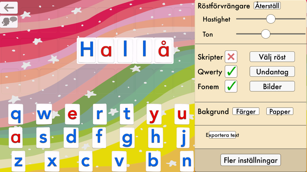 • Many settings to adapt the activities to the child’s needs (letter size, keyboard layout, assign images to words, disable some letters, high contrast modes for kids with visual impairment,...)