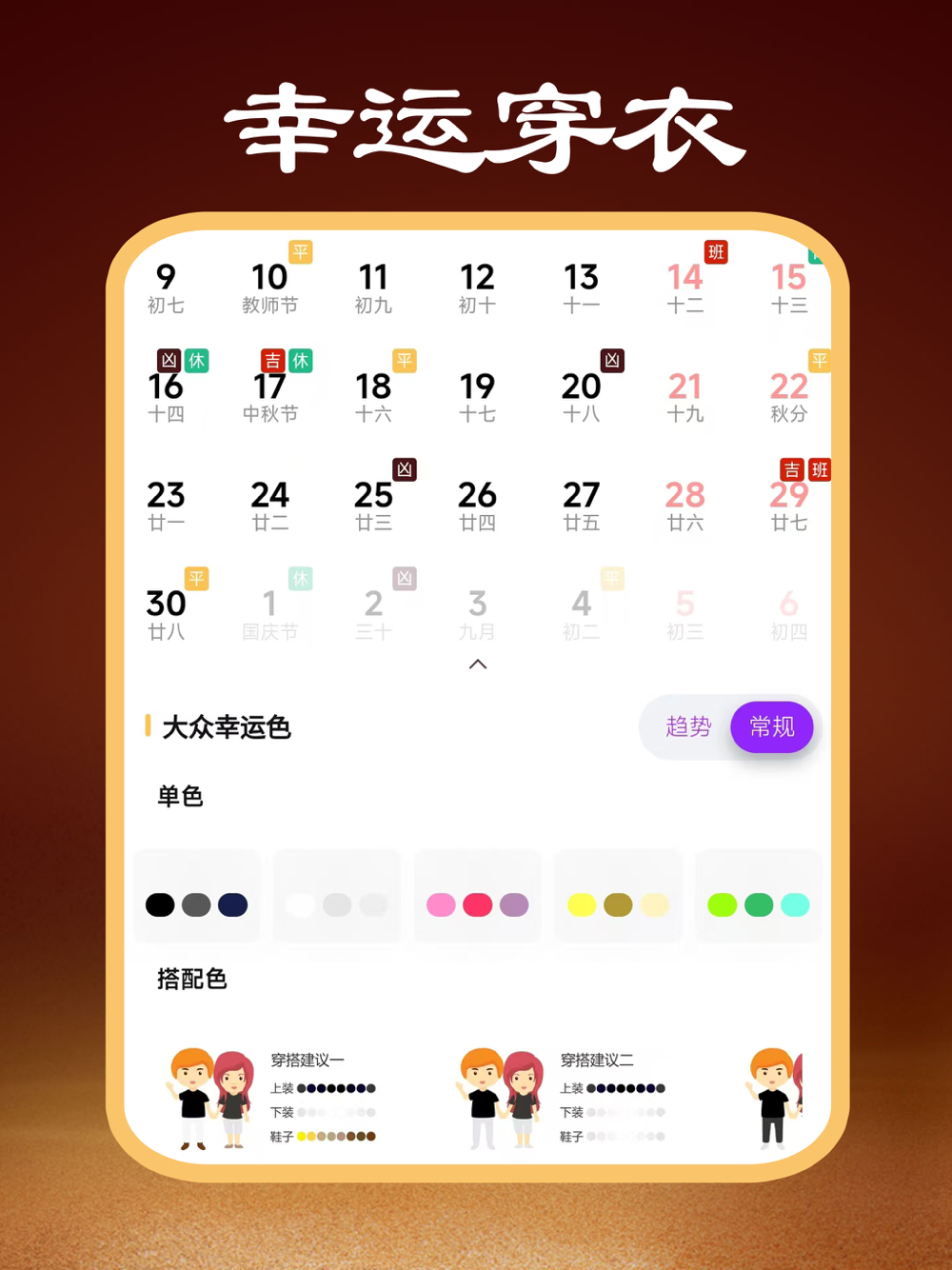 1、万年历与色彩穿搭结合,快速定位每天幸运色彩穿搭。