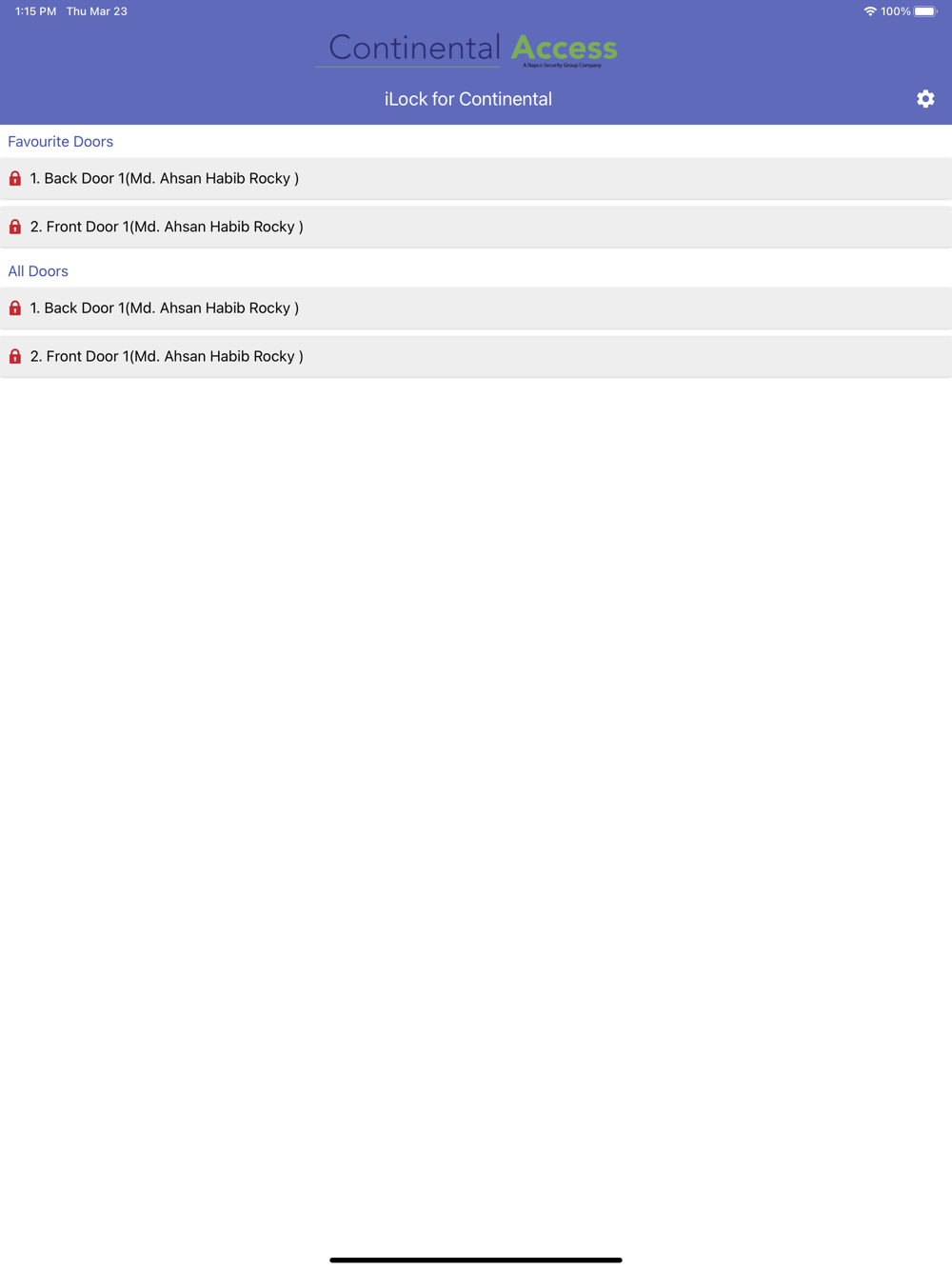 The "iLock for Continental" works in conjunction with the Continental Access CA4K software. The iLock app communicates to Architech series locks that contain Bluetooth LE technology. In addition, the iLock app communicates to a Bluetooth Reader Module, that wires in parallel with a standard weigand reader, making the reader bluetooth enabled. The iLock app provides the ability to enroll standard credentials, in addition to a maintenance (admin) credential. The maintenance (admin) credential provides the ability to change the default settings in the bluetooth reader module. Upon selecting an enrolled Door in the app, an Unlock icon will display to unlock the door. The iLock App also provides an "Unlock When Near" feature.