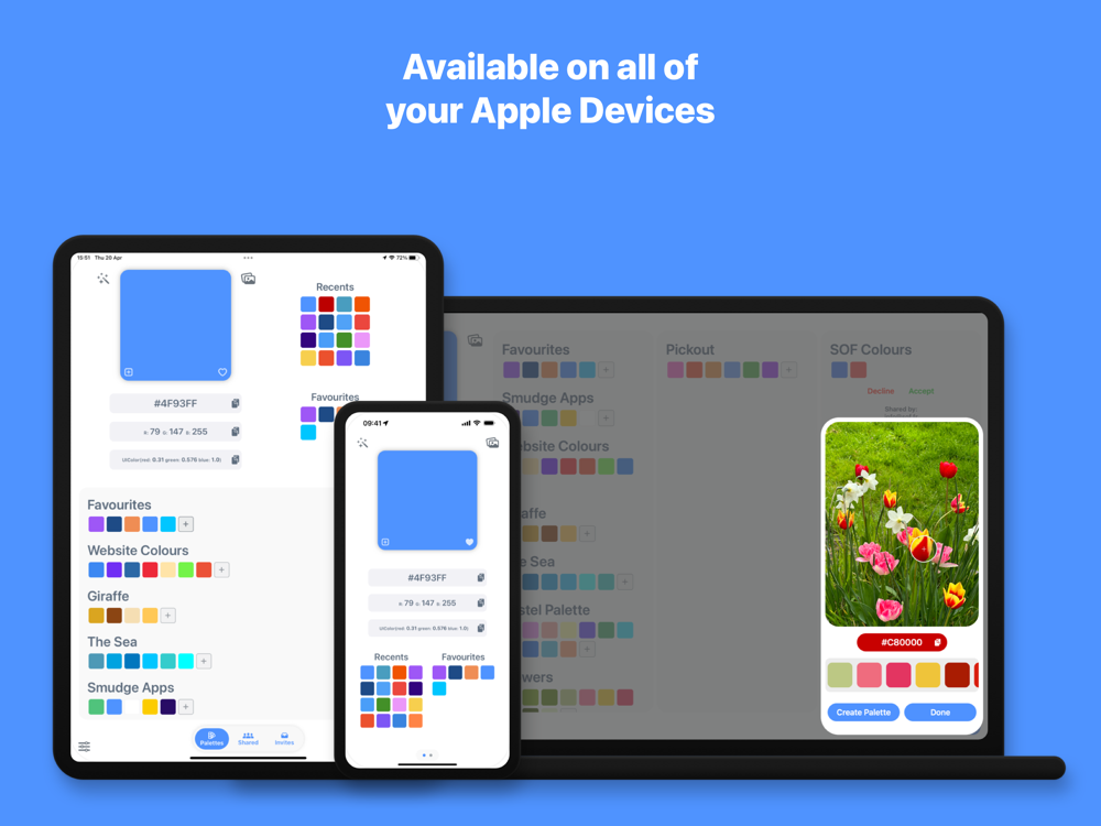You can organise your colours further, by grouping them in to different palettes for each project or brand that you are working with, name the colours to describe what part of the project they are being used for and write notes on each palette and colour. The palettes you create and colours you add will be automatically synced to the cloud and accessible on all of your Apple devices.