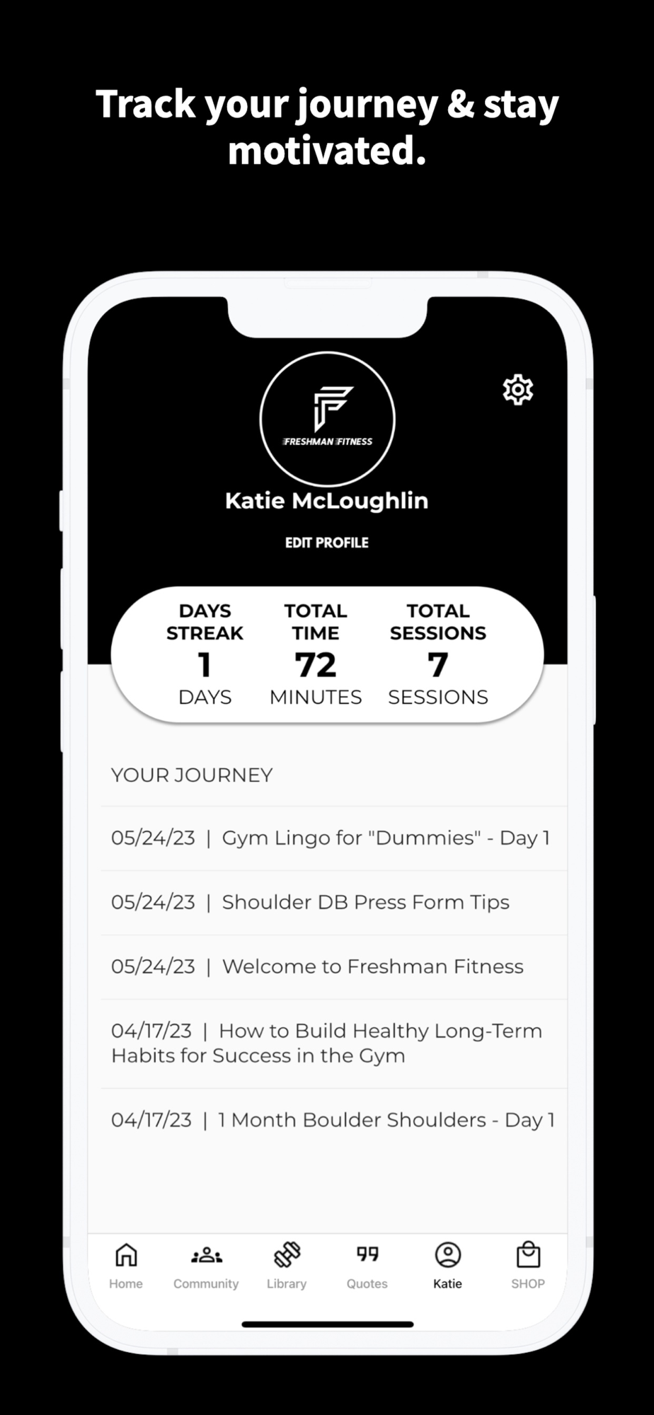 Freshman Fitness is a health & fitness app by Emily Robinson. Emily is a Certified Personal Trainer who has been on her own fitness journey for 5+ years. Over the past 2 years, she has found her passion in mentoring gym newbies.