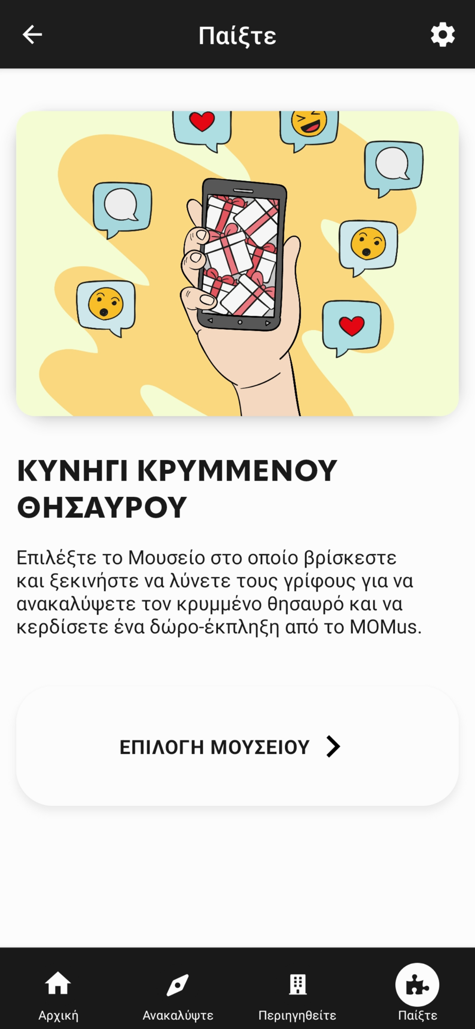 Παιχνίδι: Ξεκινήστε μια αναζήτηση θησαυρού στο επιλεγμένο σας μουσείο. Λύστε μια σειρά από γρίφους, εντοπίστε τα εκθέματα και σαρώσετε τον κωδικό QR με την κάμερα της συσκευής σας. Ολοκληρώστε το παιχνίδι και λάβετε ένα σήμα ολοκλήρωσης, το οποίο μπορείτε να χρησιμοποιήσετε για να διεκδικήσετε το δώρο σας από το πωλητήριο του μουσείου.