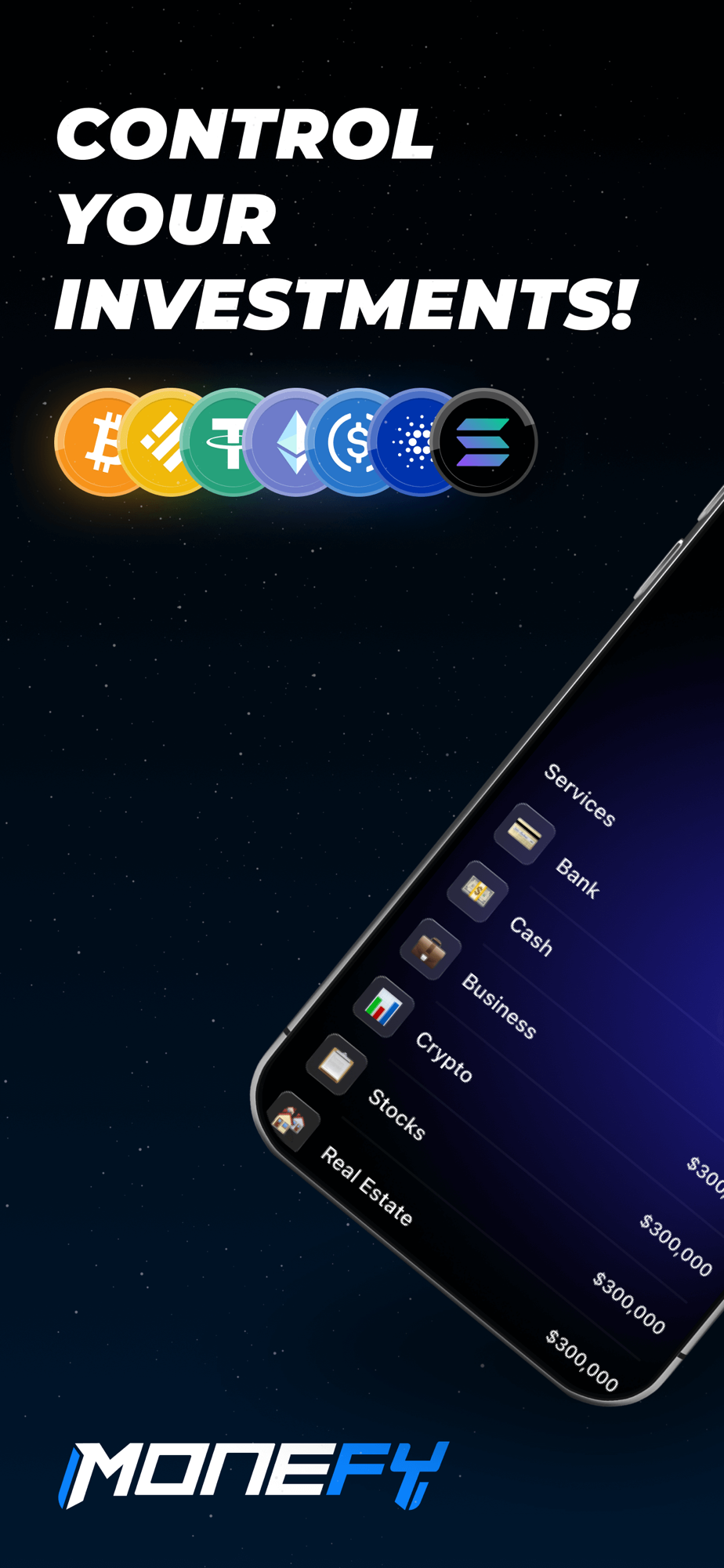 Monify is a cutting-edge application meticulously crafted and fully developed in Ukraine to empower you in monitoring your savings, managing your capital, and tracking the growth of your digital assets and alternative investments like cryptocurrency, stocks, electronic assets and preacious metals. It is precisely crafted to provide you with comprehensive insights into your financial portfolio in real time!