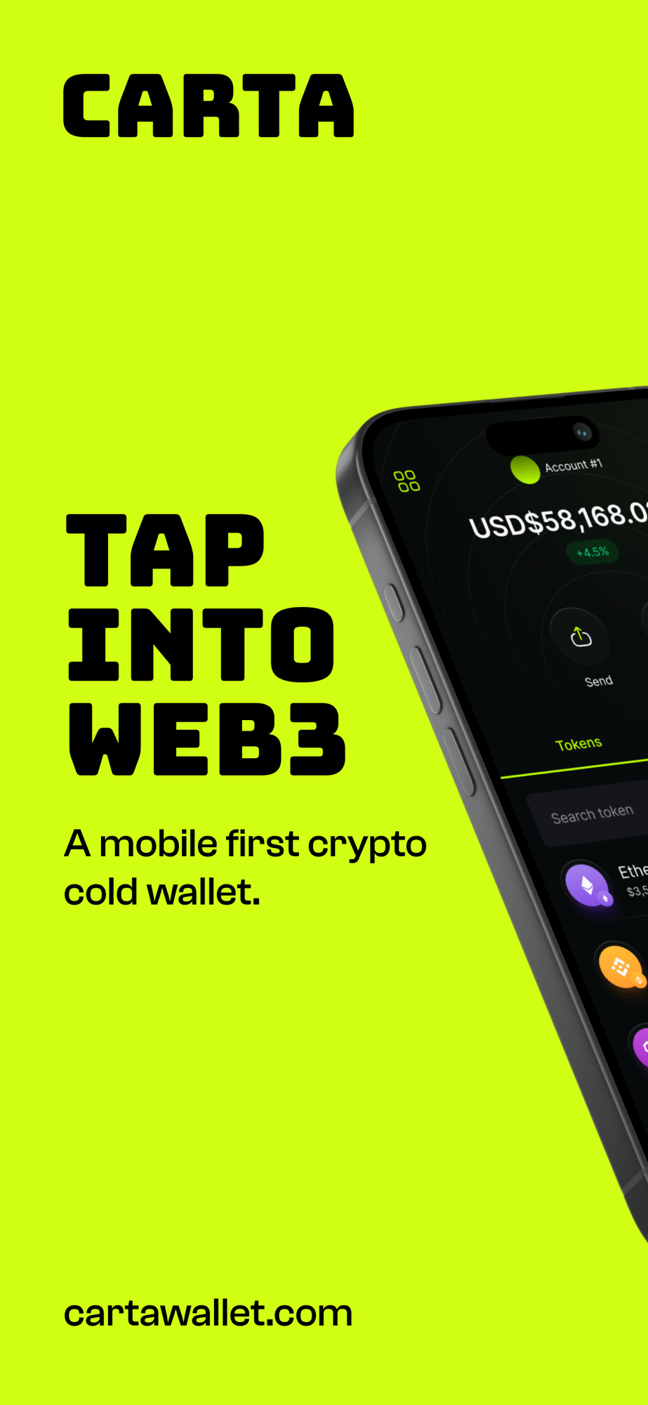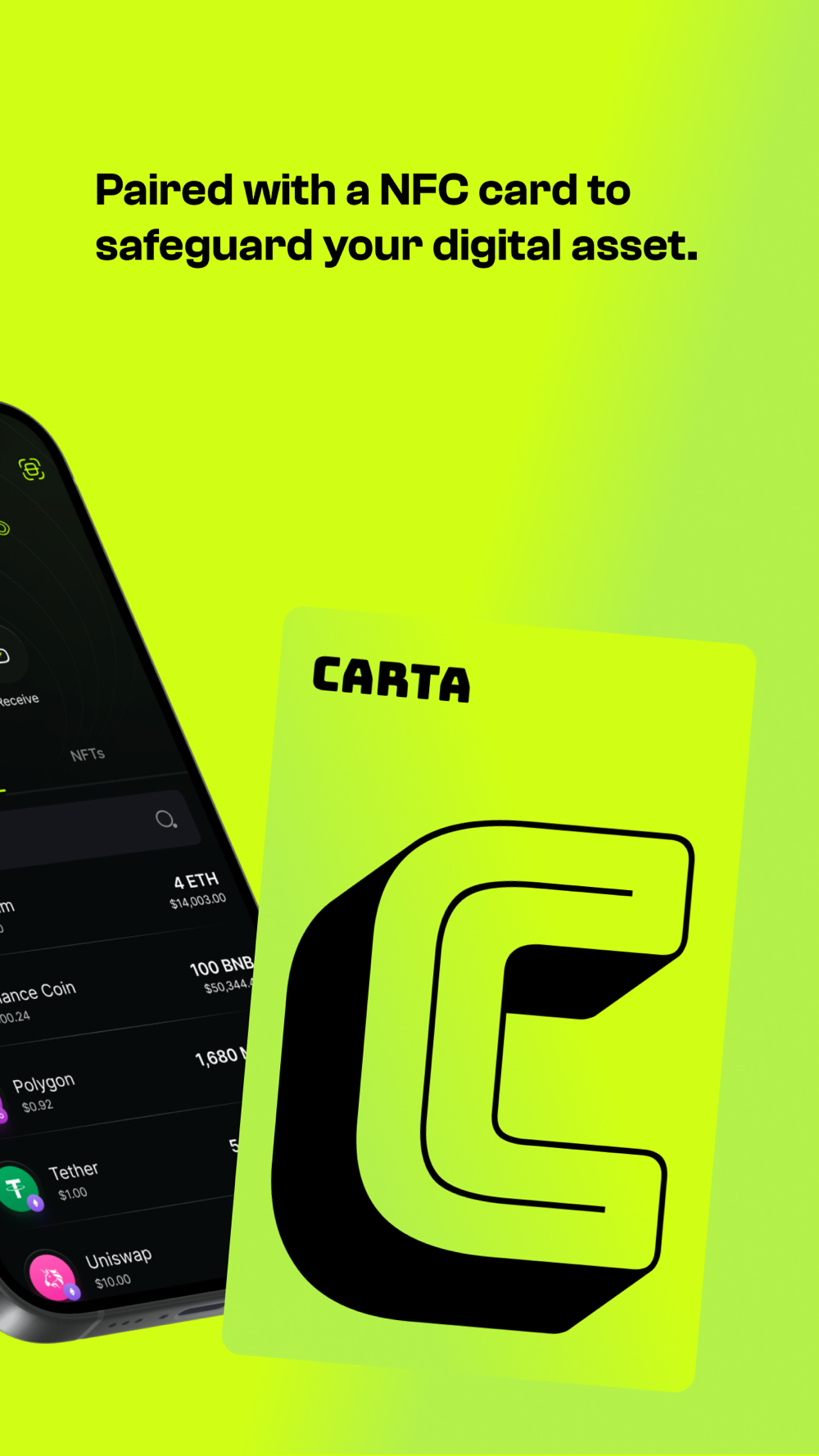 Carta Wallet is a cryptocurrency wallet for sending and receiving digital assets safely and securely. There are no USB, batteries or chargers anymore, all you need to manage cryptocurrency is a Carta card and your NFC enabled phone.