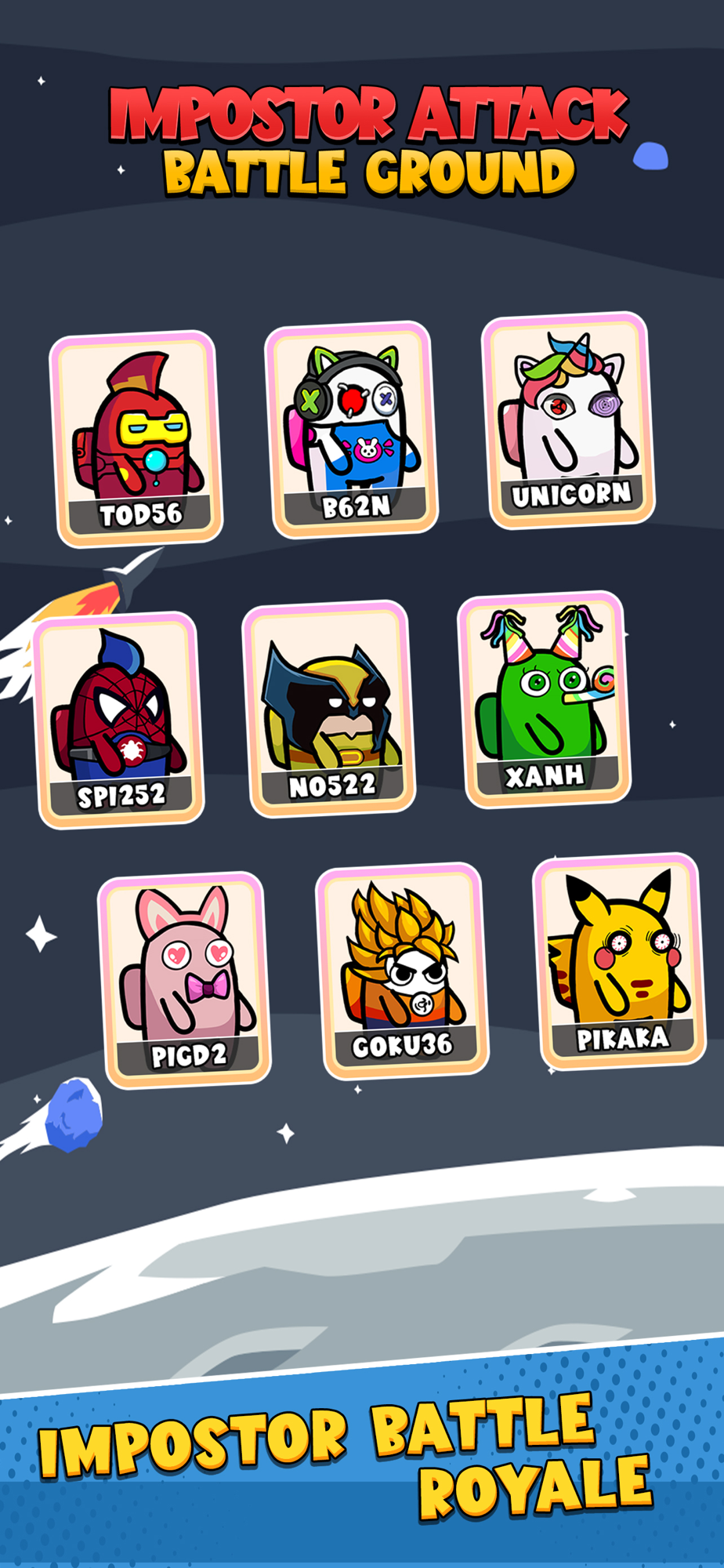 Impostor Battle Survival is a dramatic Battle Royale game that puts you in intense combat situations. Prepare to take on cunning impostors in an all-out war for survival. Will you become the ultimate winner?