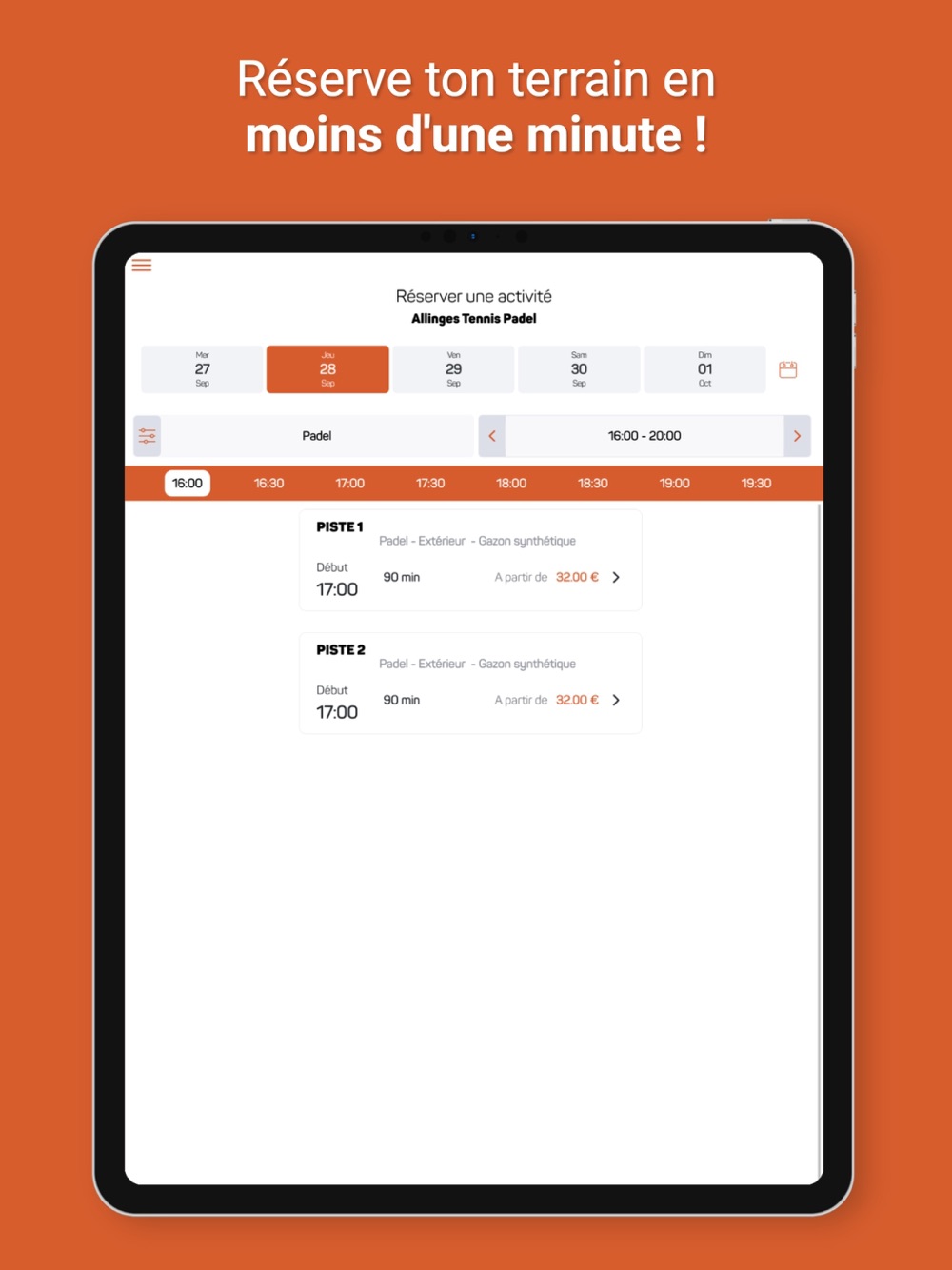 Fini la corvée de réservation ! Avec l'application tu n'as plus qu'à accéder aux créneaux disponibles et à en choisir un. Le club recevra alors automatiquement ta réservation.