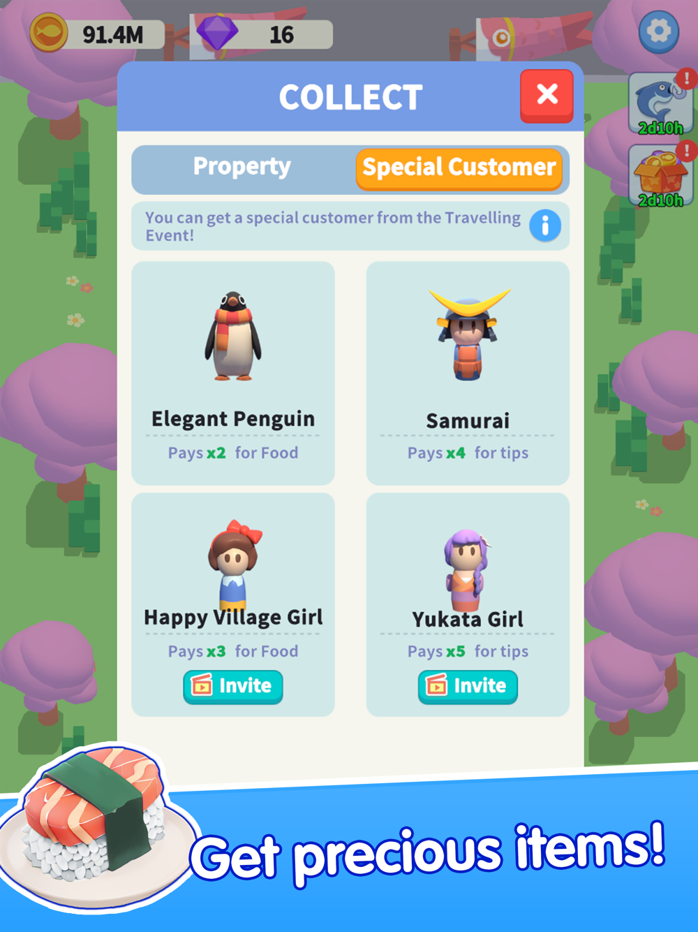 Welcome to Idle Sushi House, the paradise for sushi lovers! In this mobile game about sushi shop management, you can own your own sushi shop, make various fresh and delicious sushi, meet the needs of customers, earn income, expand your business, and become a sushi master!