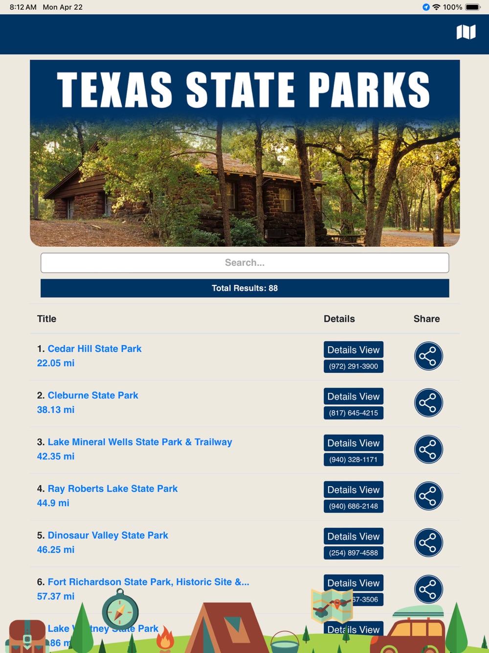 Texas State Parks are beautiful! Use this app to view them all and your proximity to each location! Include details view with phone number to each location and also a link to each site!