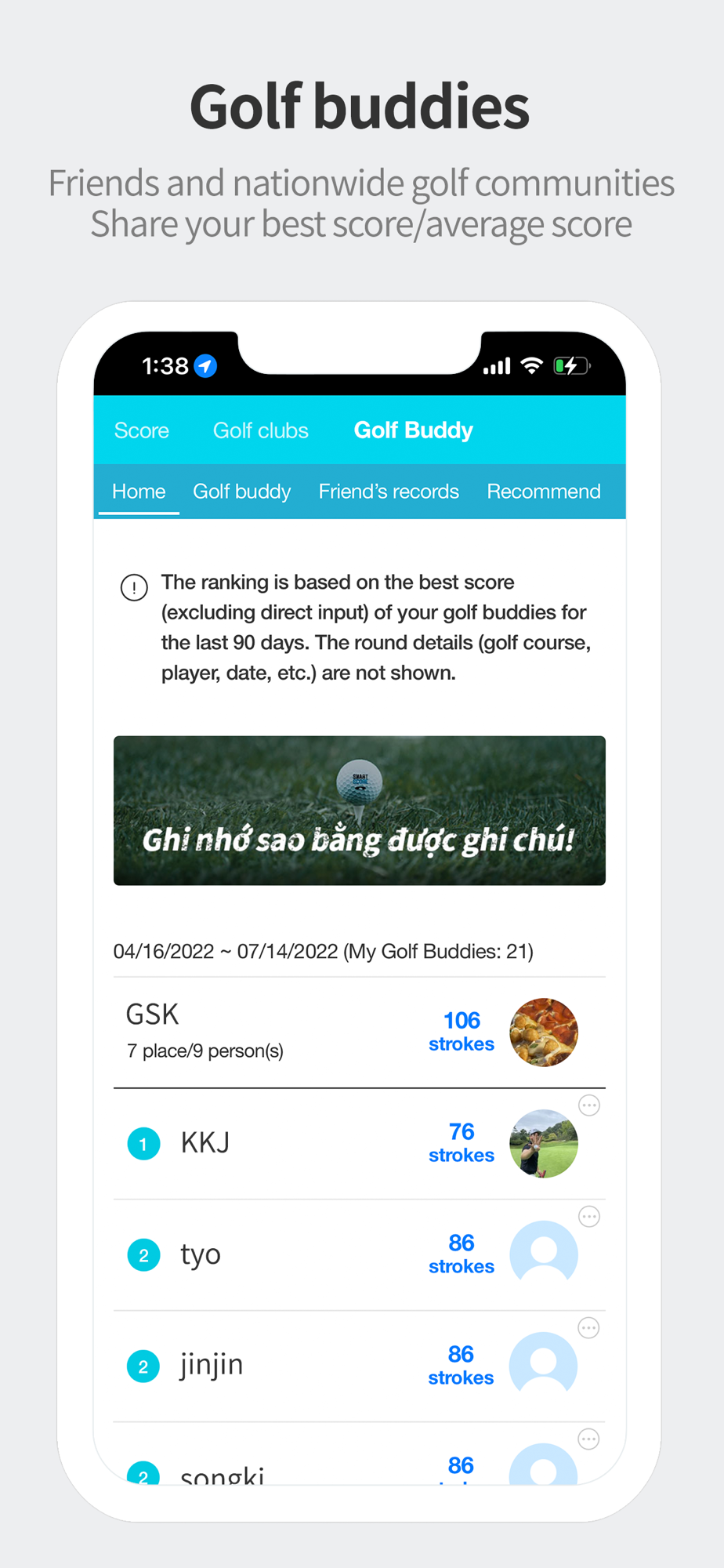 - Scores/photos management and automatic transfer from nationwide golf clubs