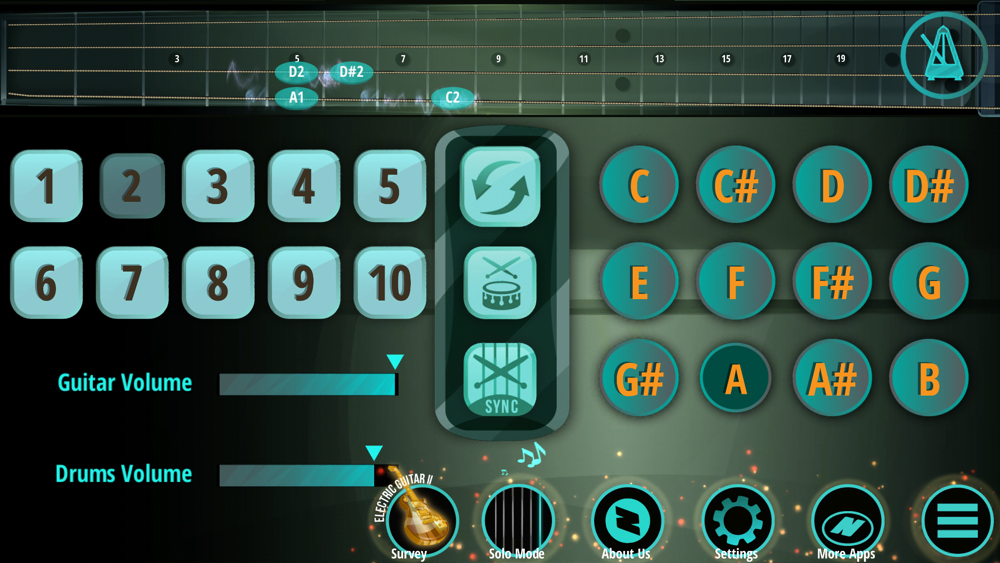 - 2 play modes: chords or solo (fret/chord mode)