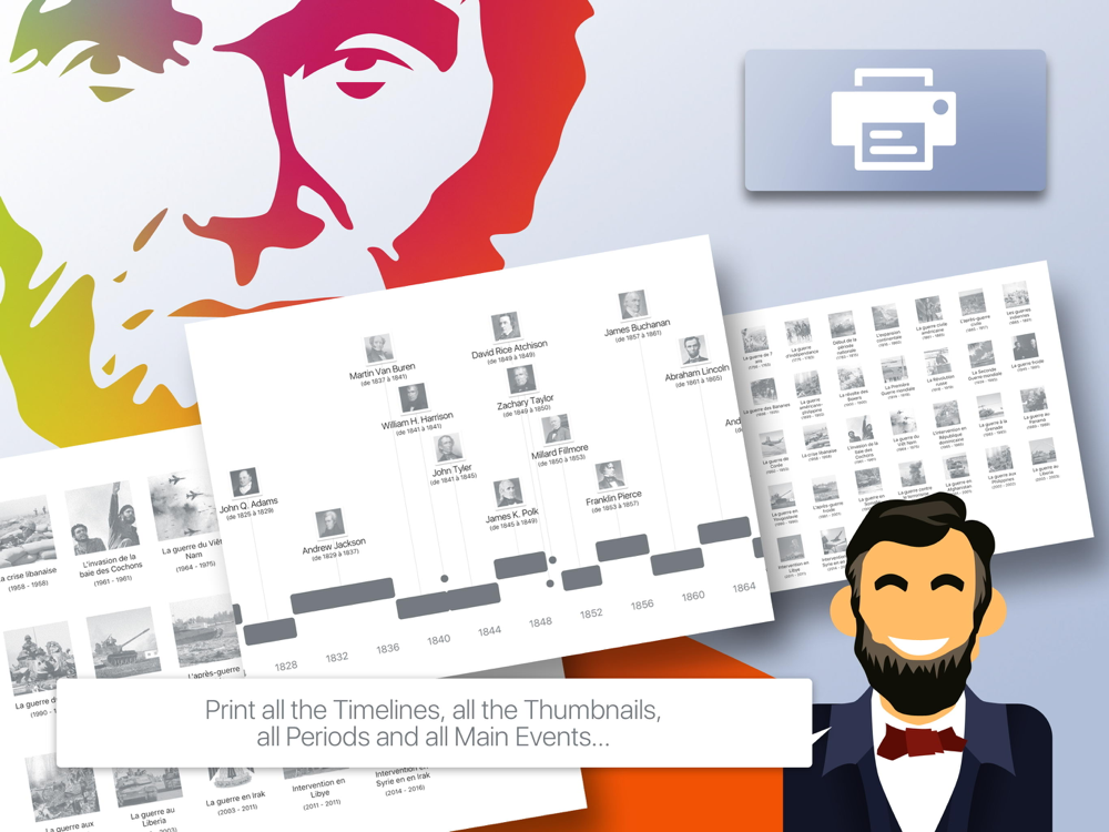 The learning mode allows you to practice all topics. In this mode, you'll see presidents, wars, key events and periods in interactive timelines. You'll explore the thumbnails of the presidents and wars on a single screen, to get the whole picture. Finally, you can print the timelines, thumbnails and a list of the main events and periods.