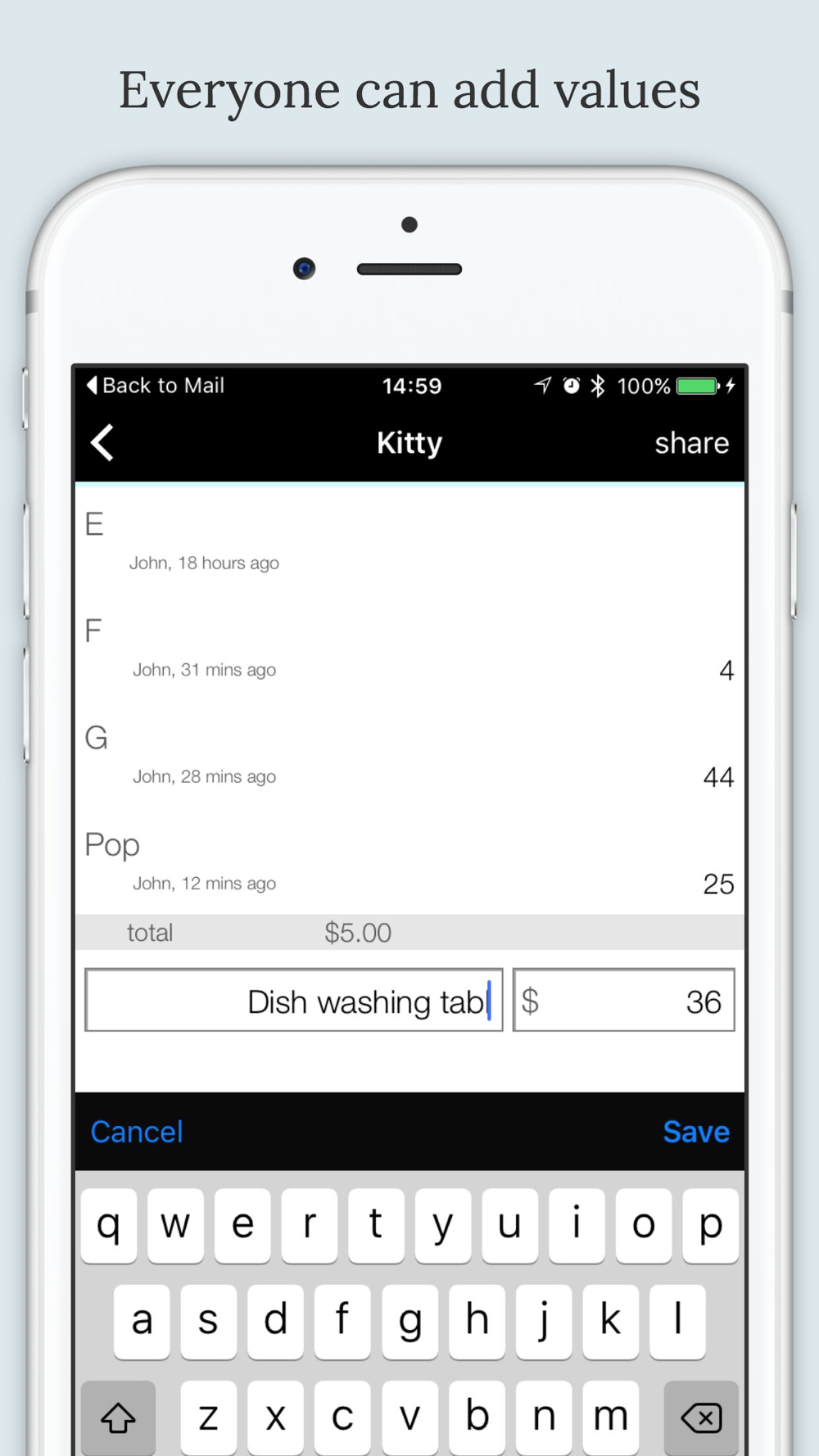 Great for household budgets, going on a share holiday, or keeping track of what you and your partner have bought.