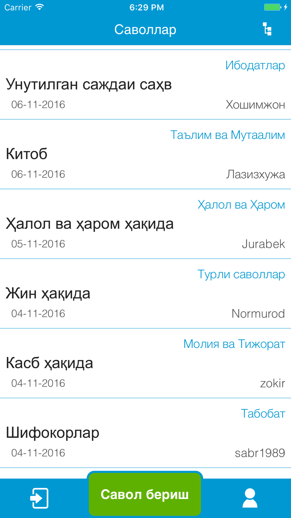 Ушбу дастур ёрдамида Сиз savollar.islom.uz саҳифасидаги савол-жавоблар билан танишишингиз мумкин. Саҳифада фазилатли Шайх Муҳаммад Содиқ Муҳаммад Юсуф раҳимаҳуллоҳ томонларидан берилган жавоблар, у кишининг вафотларидан кейин Ҳазрат раҳимаҳуллоҳнинг ушбу соҳадаги лаёқатли шогирдларидан ташкил топган ҳайъат, ҳанафий мазҳабидаги мўътабар китобларидан фойдаланиб берилган жавоблари жой олган.