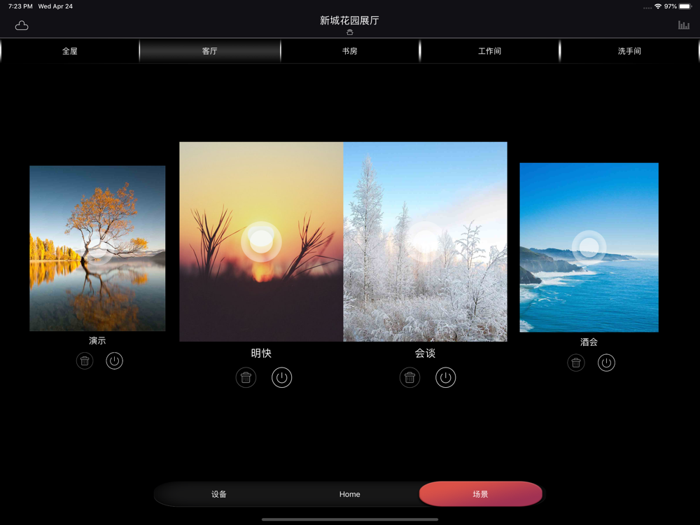 --设定情景模式,根据实际需要,设置回家、外出、会客、就餐、影院、睡眠等场景模式;轻轻一触,让您拥有安全便捷,环保舒适的智能生活。