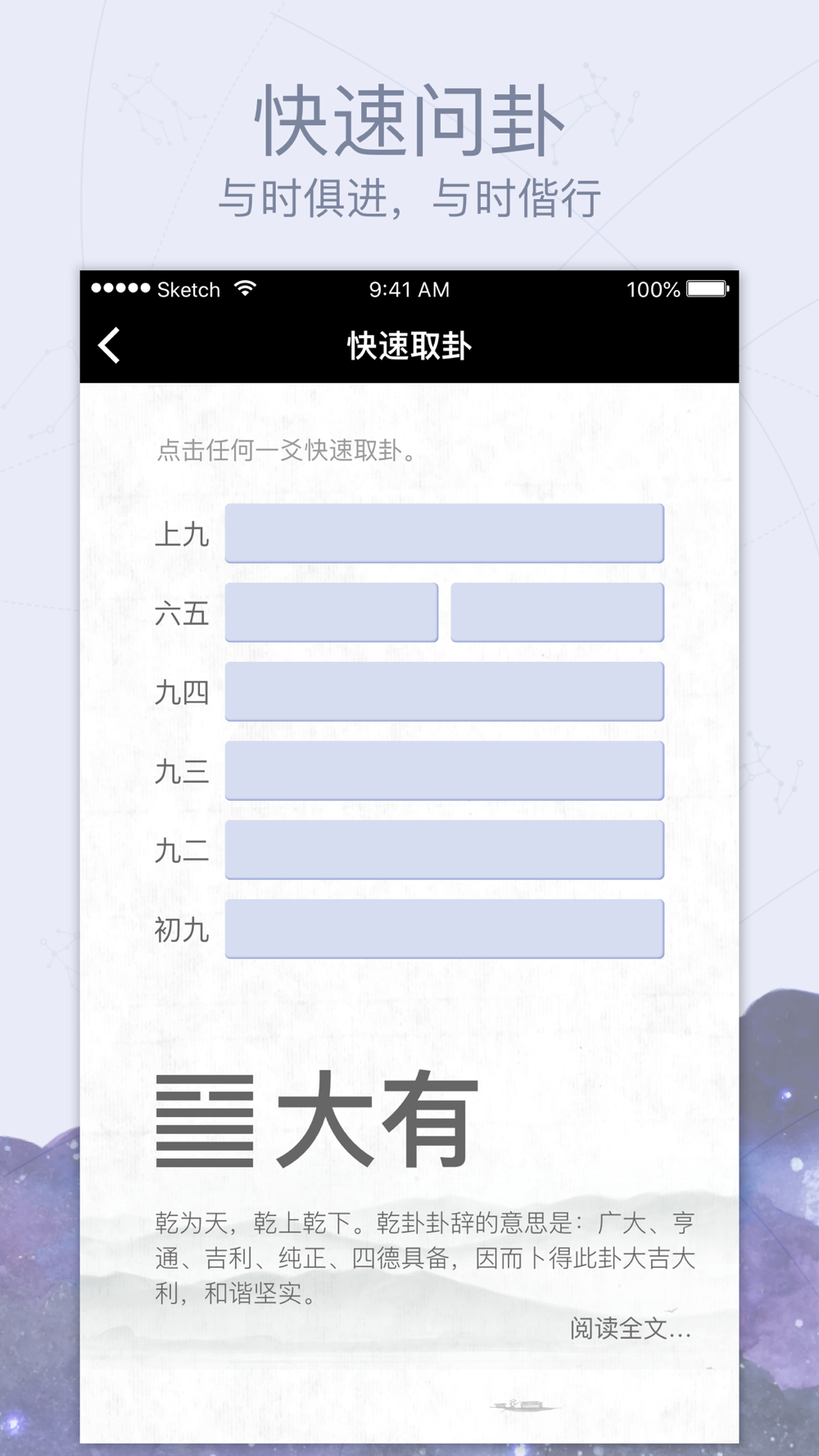 灵机一动,易经占卜运势App,是您身边的易经命理大师!采用最古老的六爻占卜法,操作简便,精准度高。
