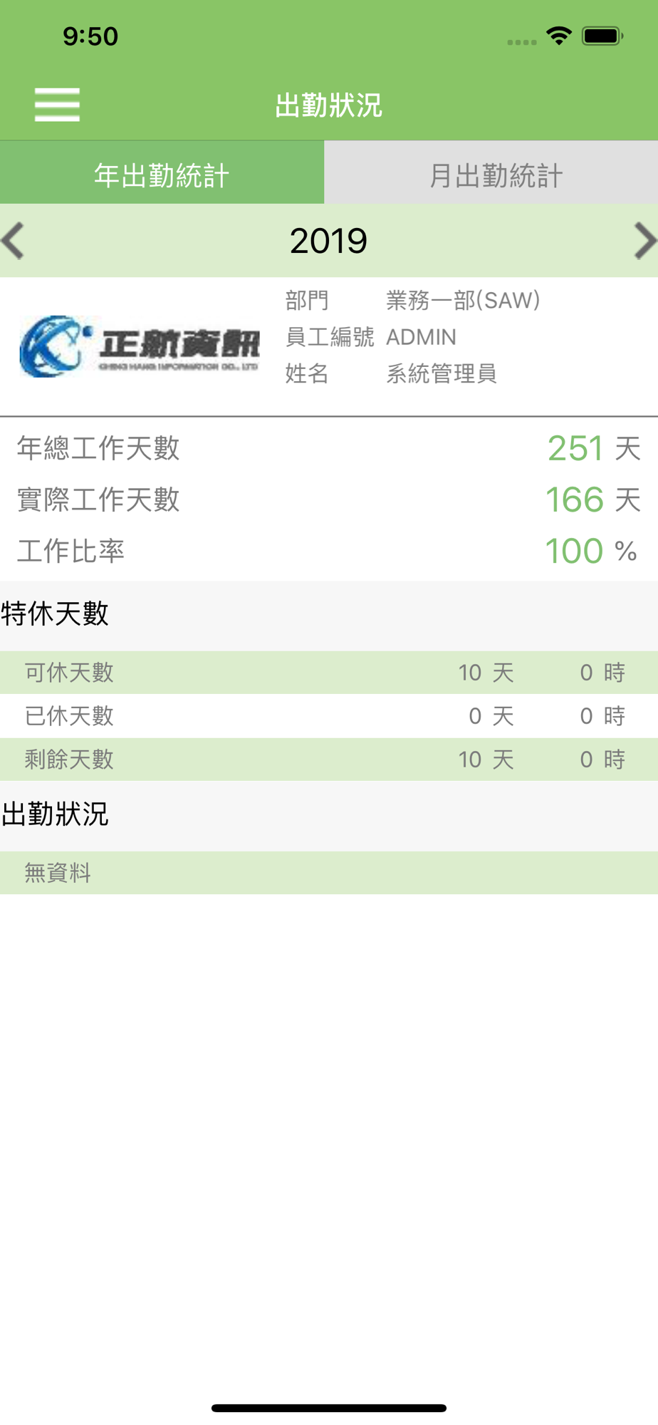 出勤狀況:查詢個人年度及各月出勤統計。