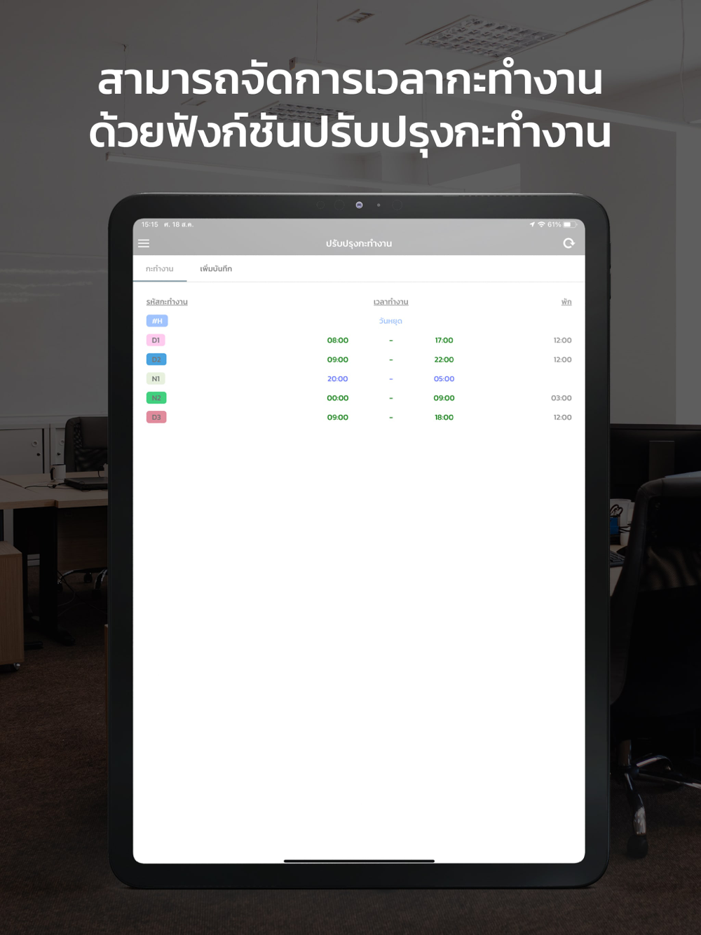 - ดูรายการกะทำงาน แสดงให้เห็นเป็นปฏิทินว่าตนเองเข้ากะทำงานใดในแต่ละวัน (มีการกำหนดกะทำงานล่วงหน้า)