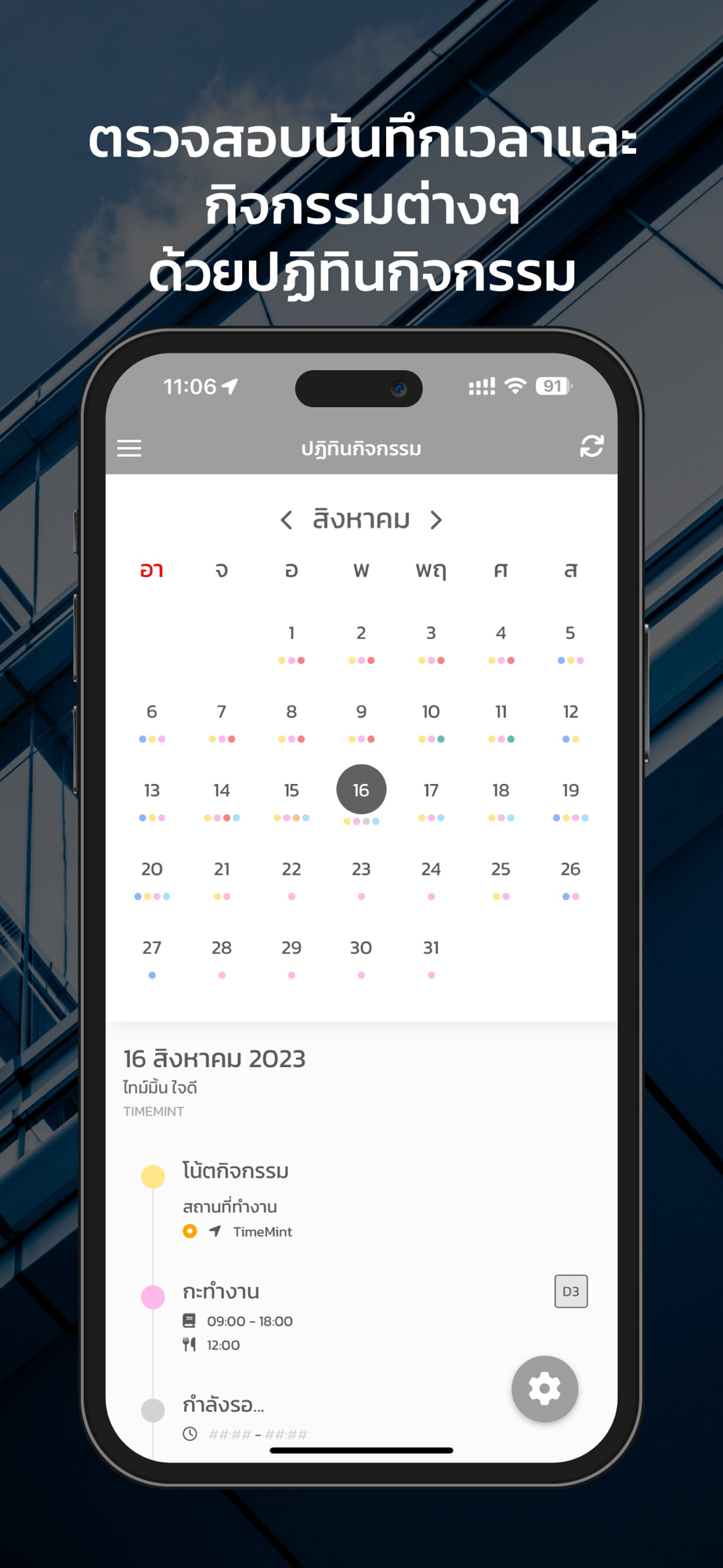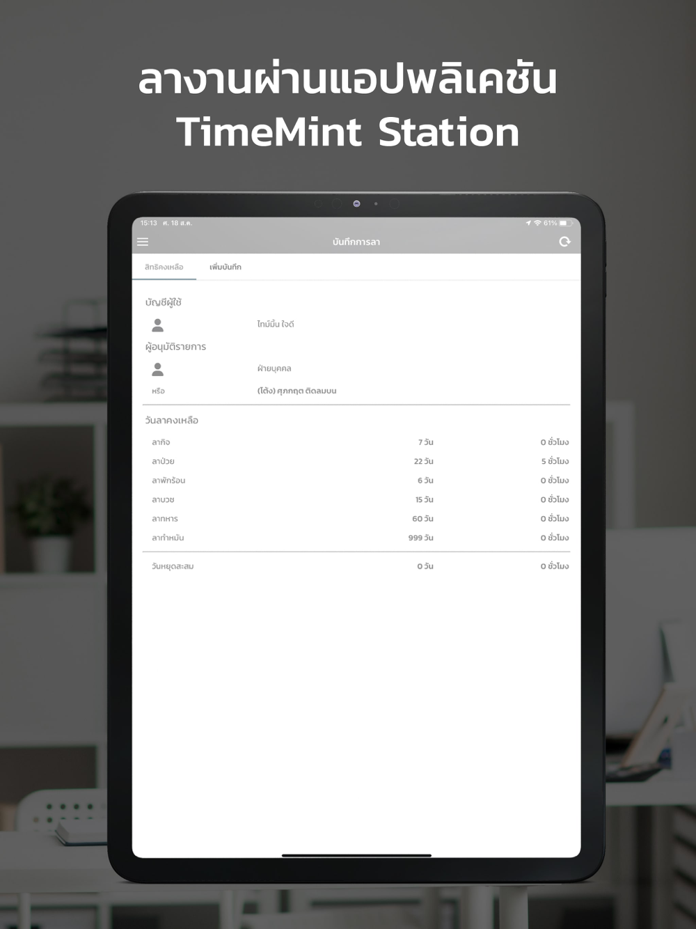 - พนักงานสามารถกดขอลา ดูประวัติการเข้าออกของตนเอง และดูรายการลาที่ได้รับอนุมัติหรือปฏิเสธผ่านทางหน้าแอป TimeMint Station ตัวนี้ได้ทันทีที่ต้องการ