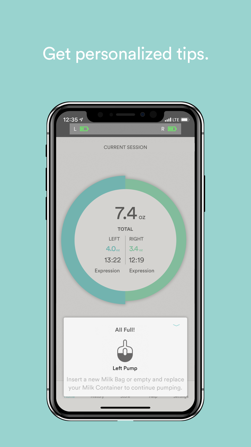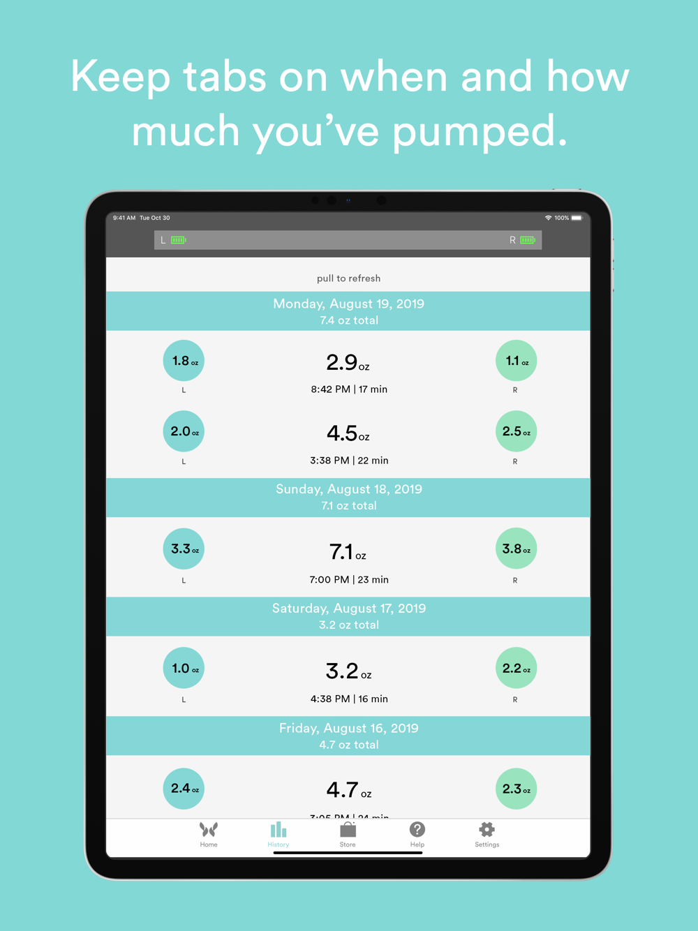 HISTORY: Your entire pumping history is available in the app, so you can start to discover patterns in your milk production and meet your breastfeeding goals.