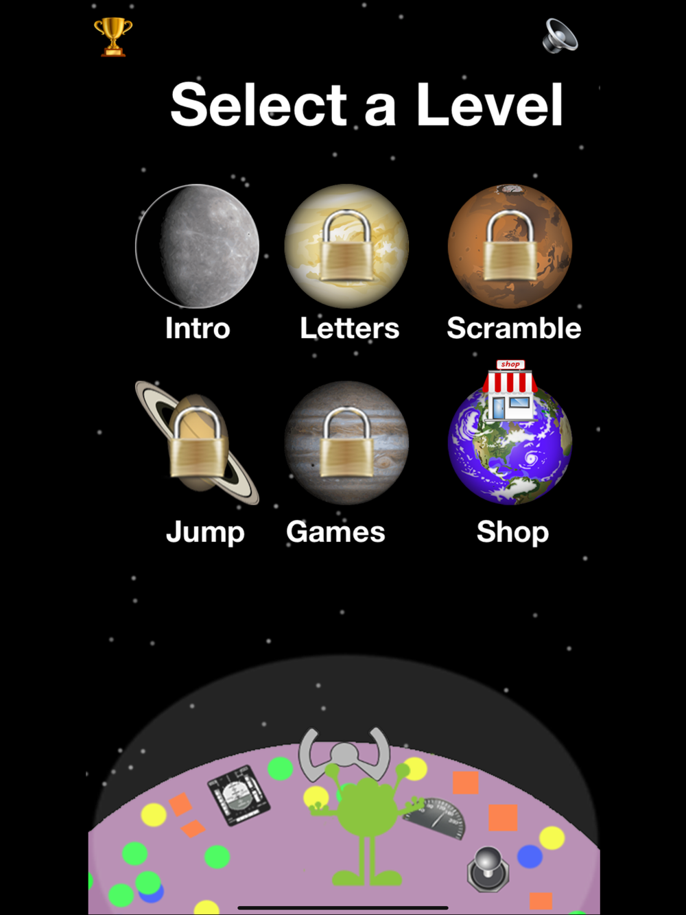Save up coins for a new spaceship, character upgrade, or to unlock shape puzzle games. Buy a freeze potion from the store to slow down letter movement and make letters easier to catch.