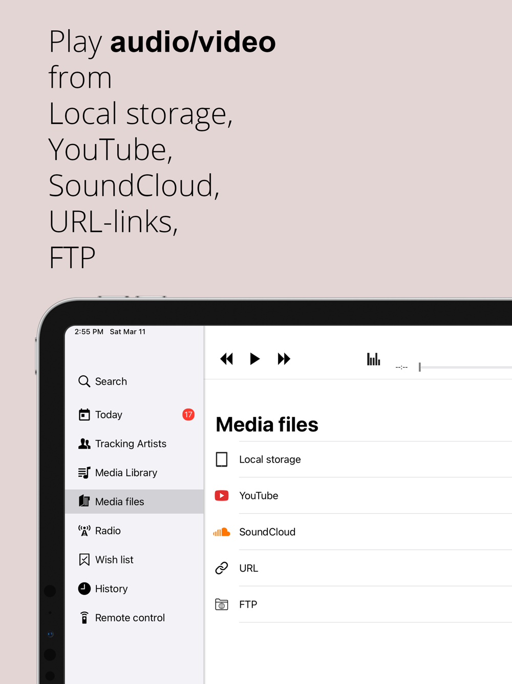 ArtistShot keeps track of your favorite artists and notifies about new albums and concerts. Play audio/video from Local storage, YouTube, SoundCloud, URL, FTP, Online radio.